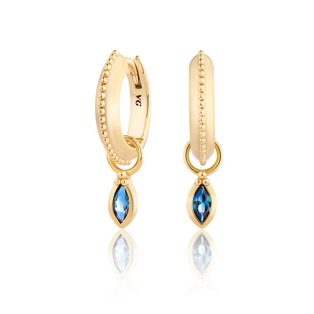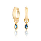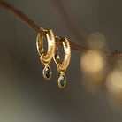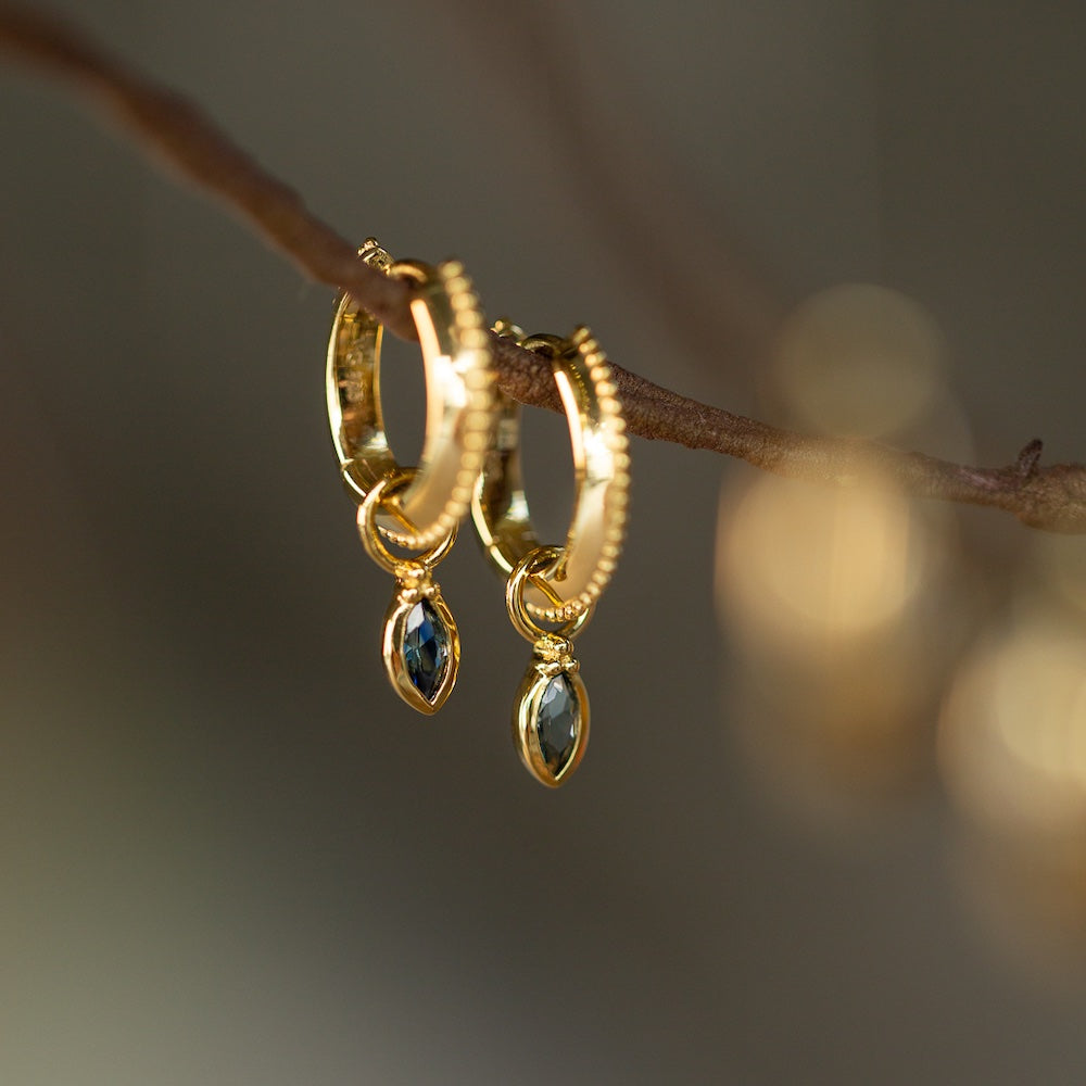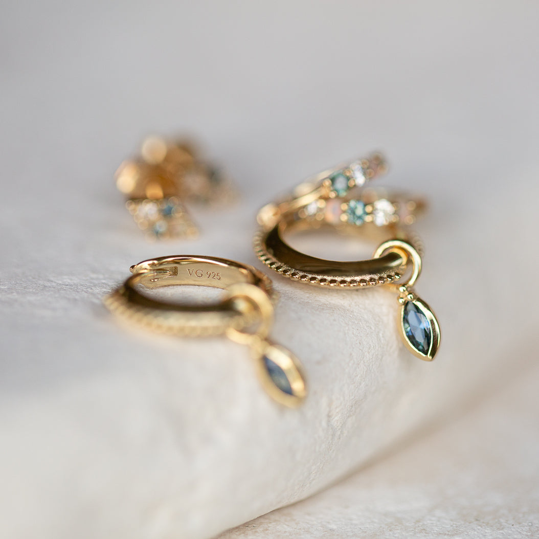 The Ishani Hoops are crafted in 14k Gold Vermeil with a fine knife-edge profile and delicate milgrain detail. Suspended along the curve are Marquise-cut Australian Teal Sapphires (bezel set) that both catch the light and hold it, with quiet allure.