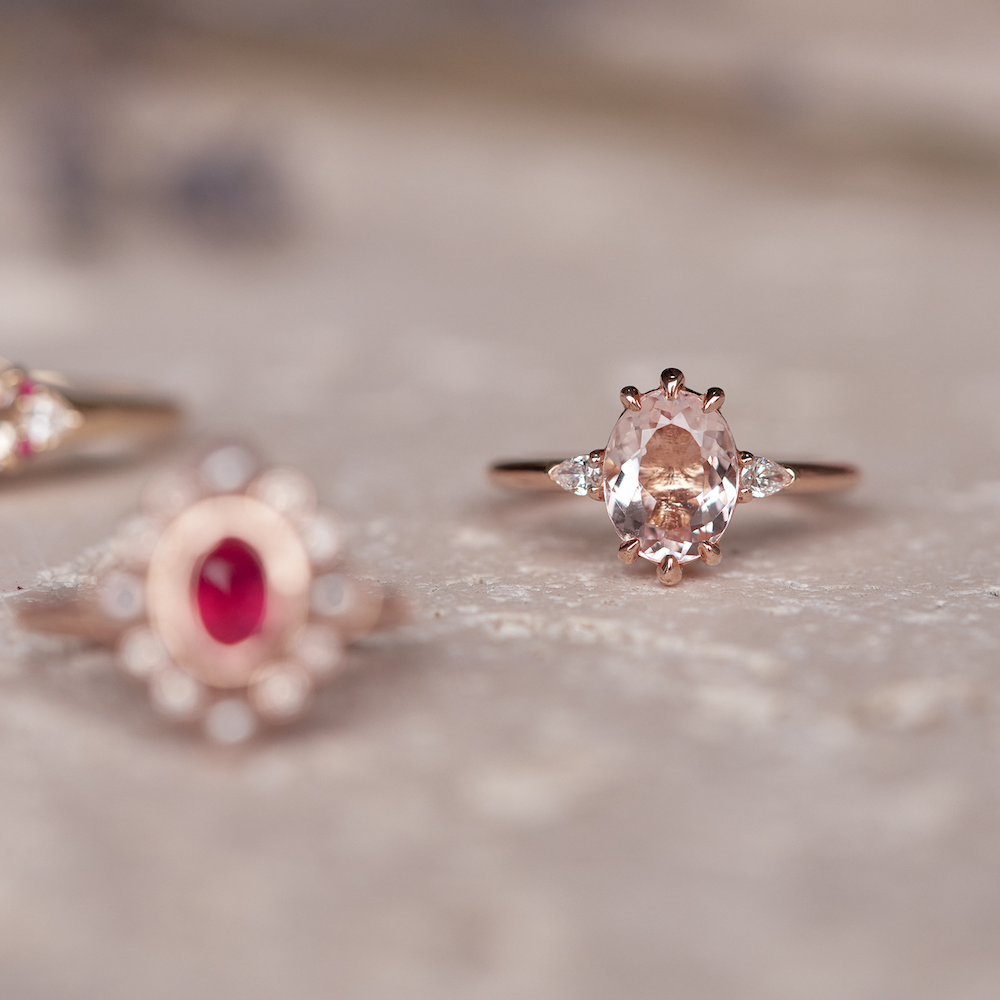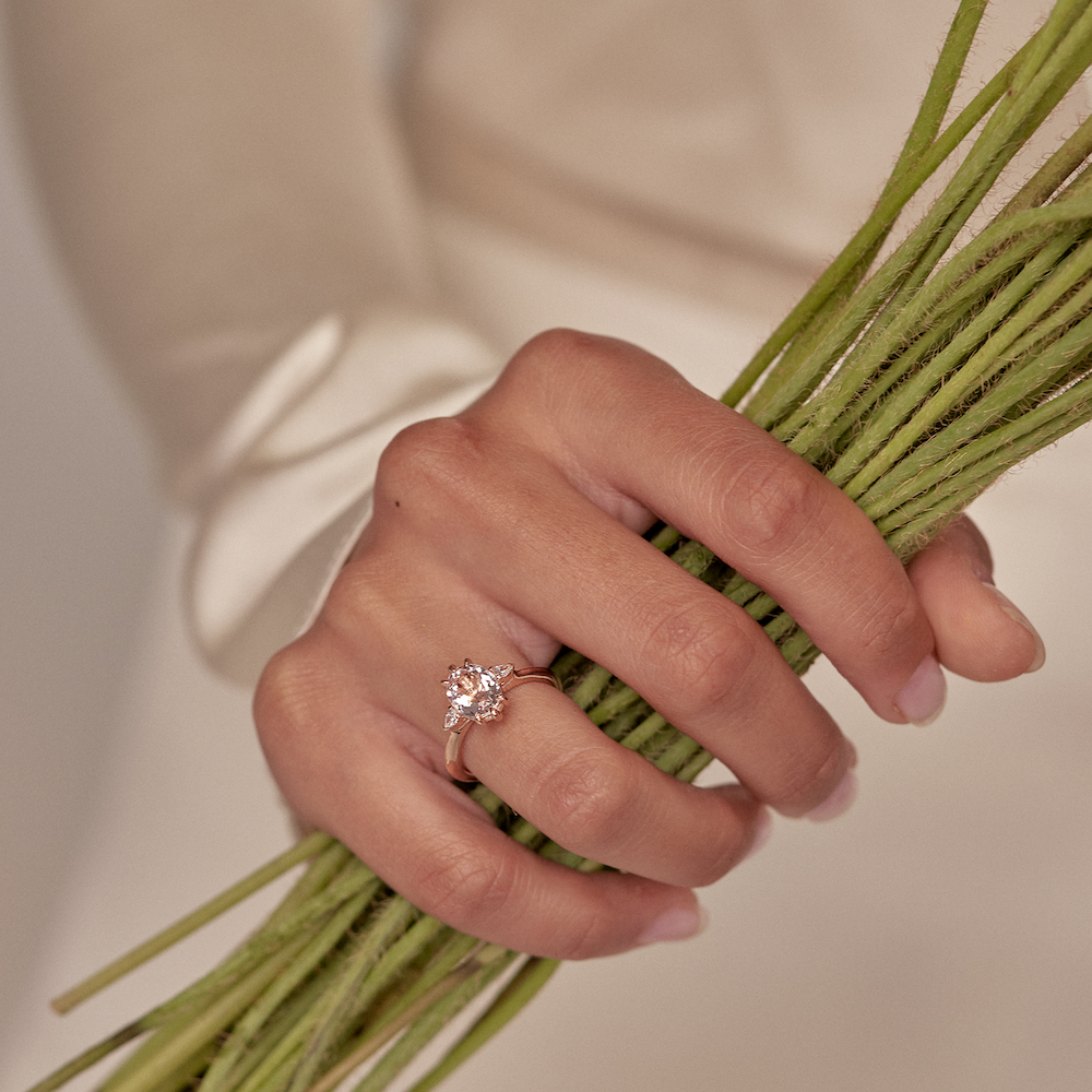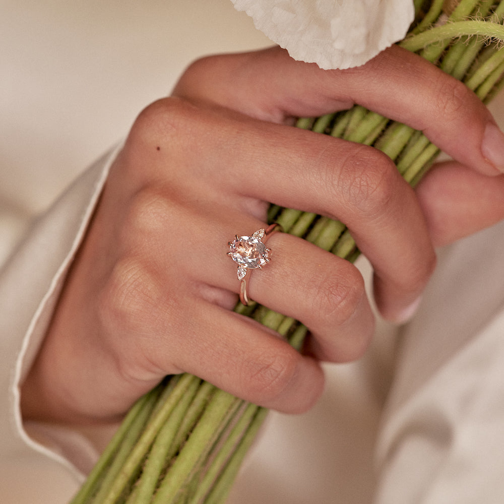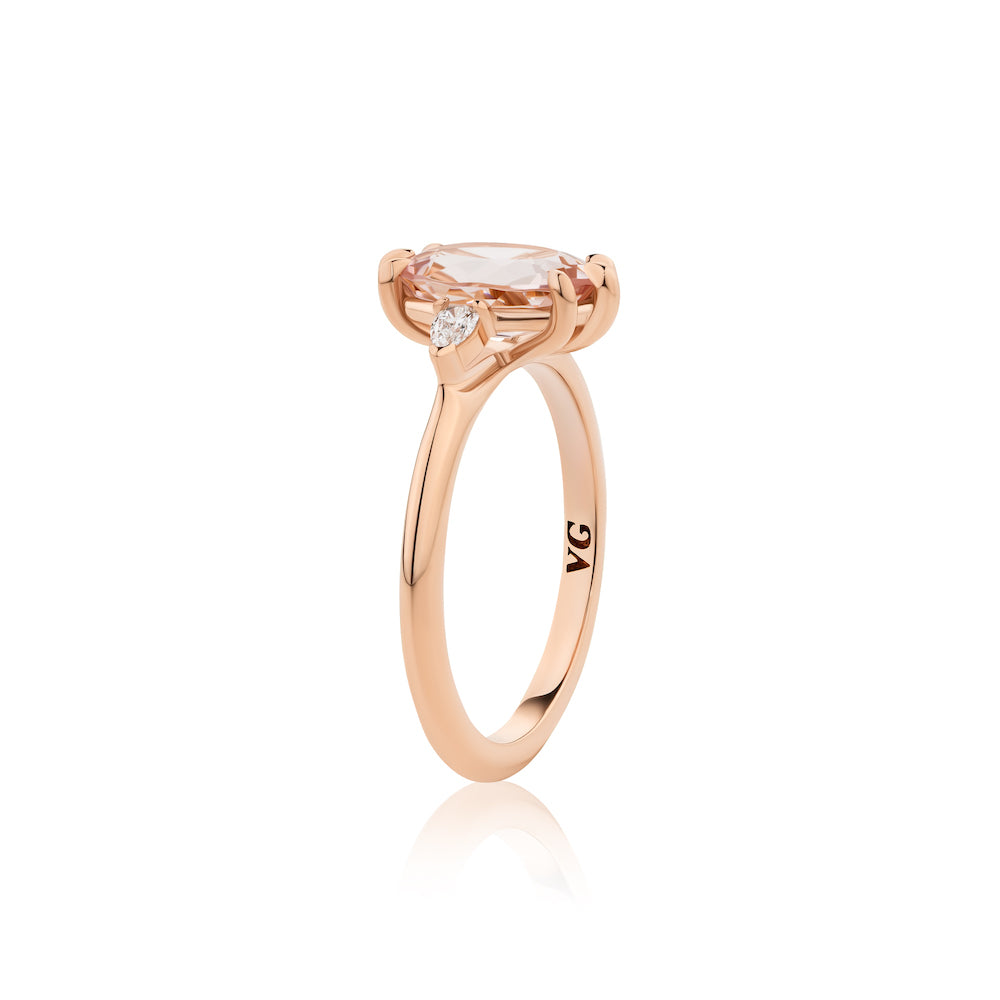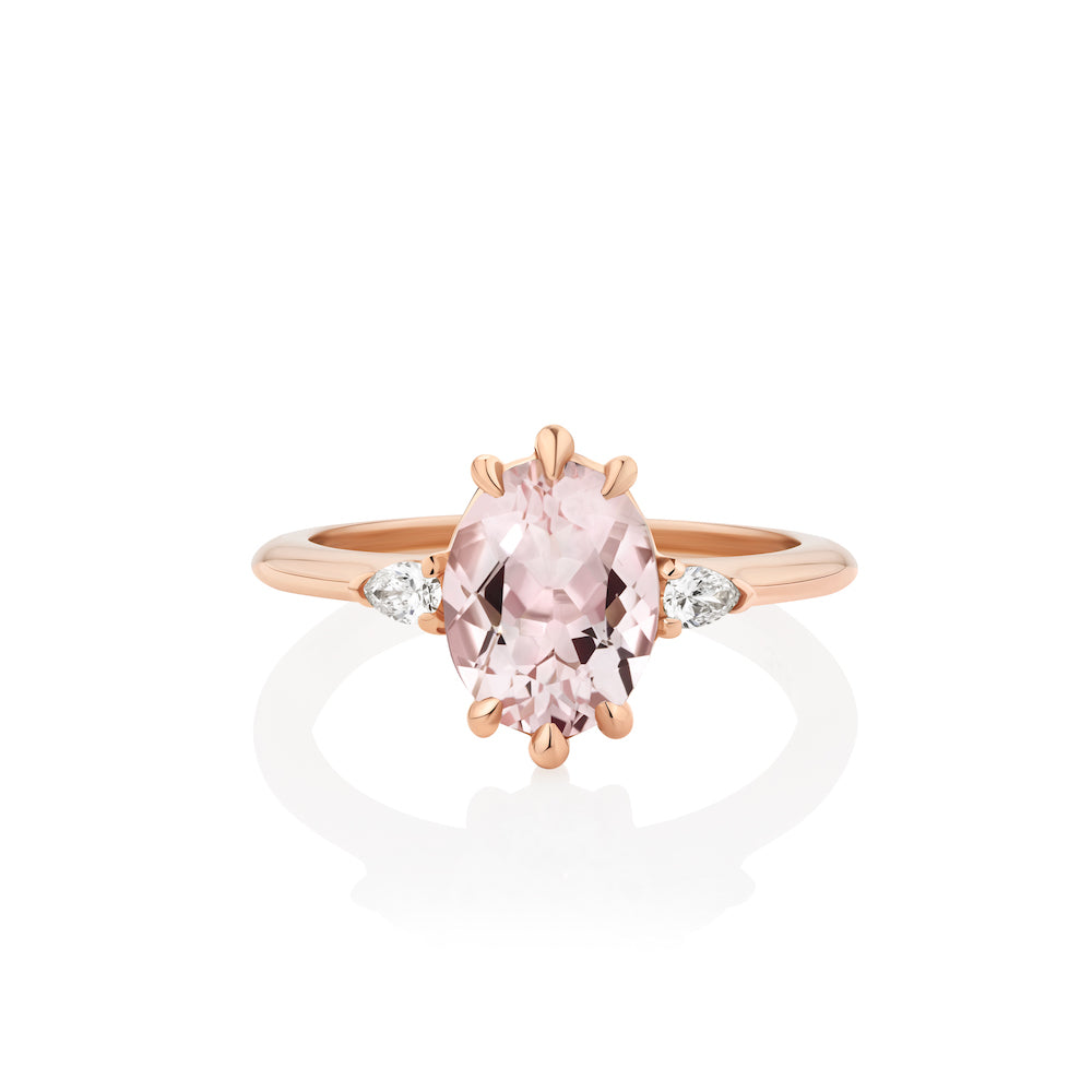 The Magnolia ring elegantly features a light pink Morganite with a distinctive triple claw setting at the top and bottom. This soft centrepiece is accentuated by pear shaped White Diamond accents, set into a finely crafted band of polished Rose Gold.