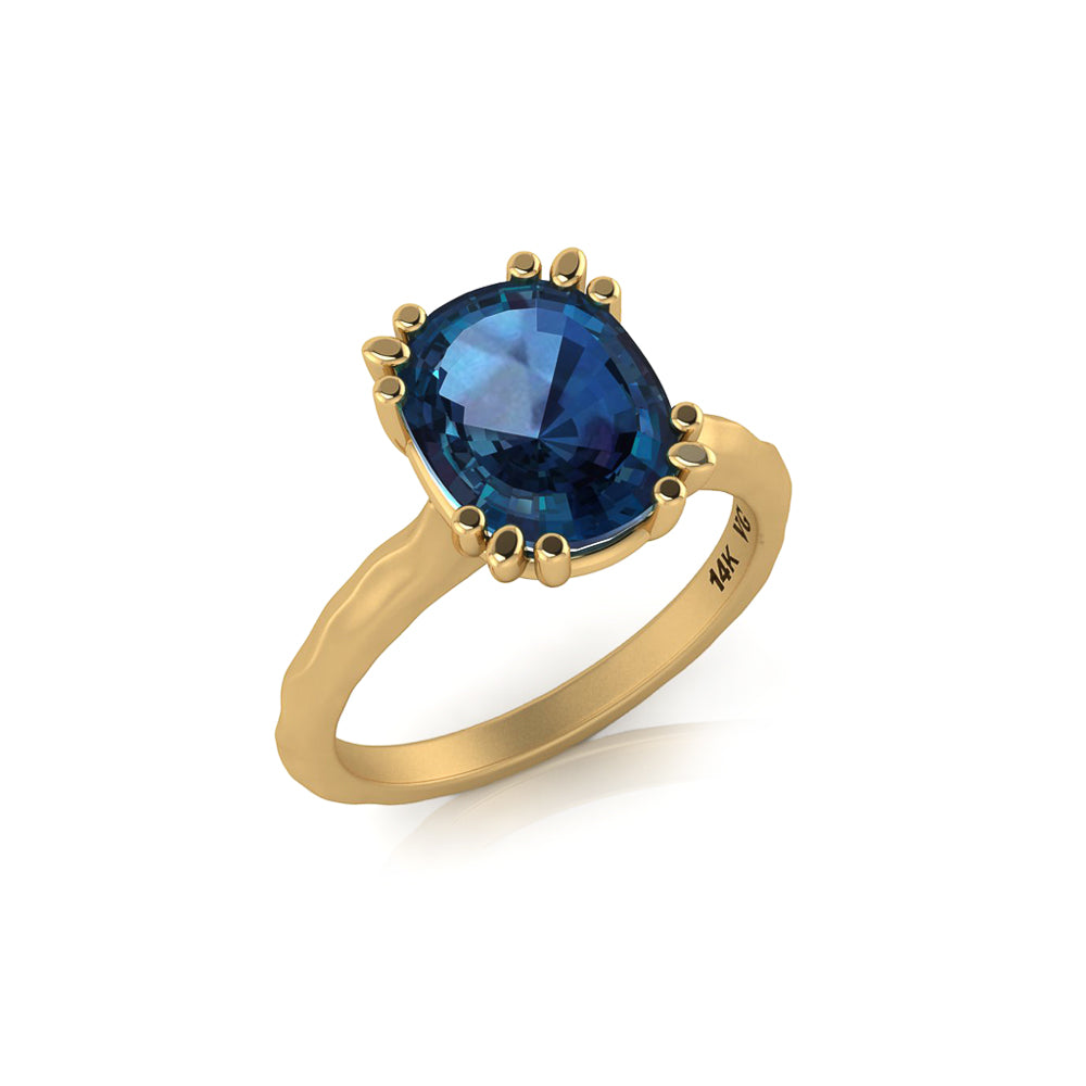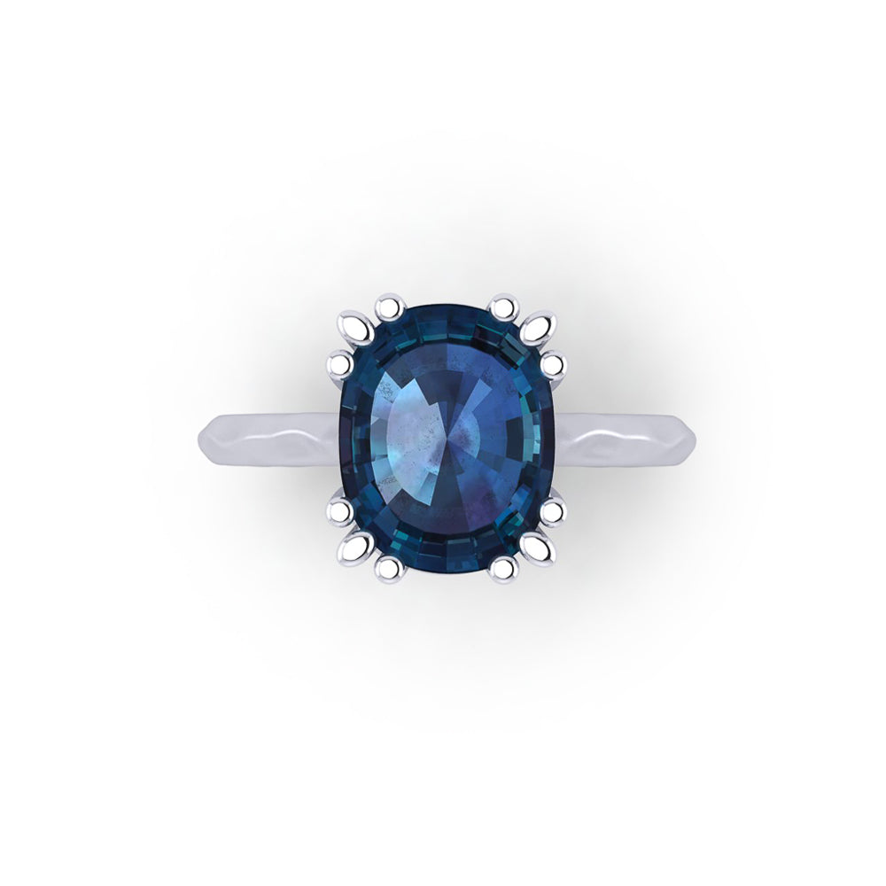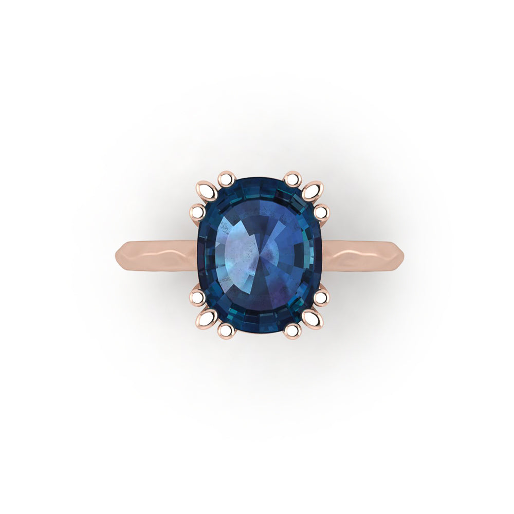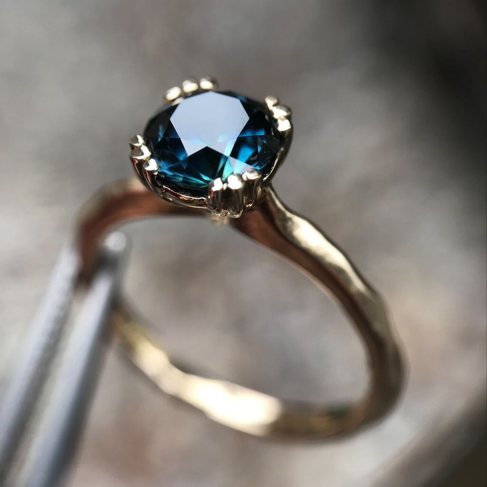The Violet Gray Fern ring is a variation of the beloved Francesca, but Solitaire rather than a trinity (triple stone) design. Your chosen central gemstone will be held by 12 claws and an organic, molten finished solid band.