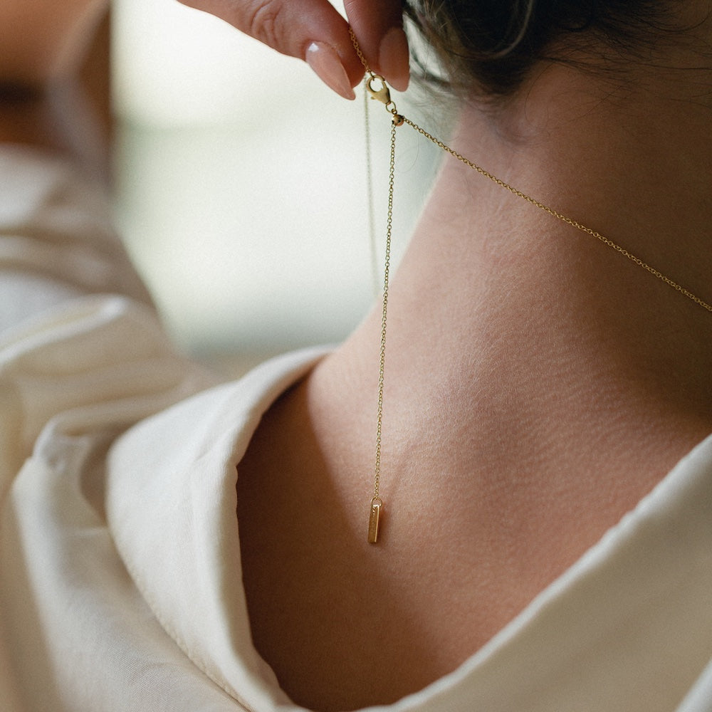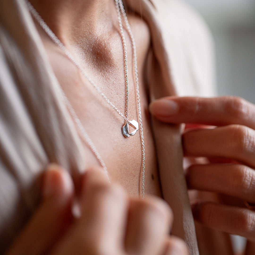 Our signature Violet Gray cable chains are fully adjustable — thoughtfully designed without fixed rings. To find your perfect length, simply slide the chain through the clasping ball by gently pulling on the rectangular tag.