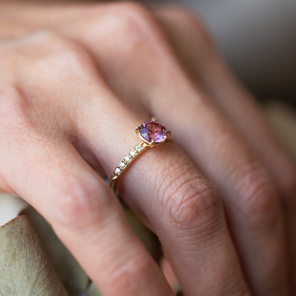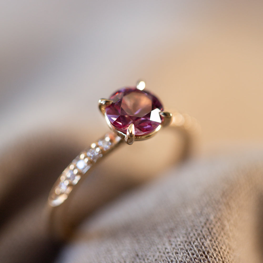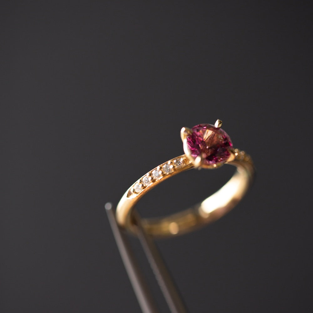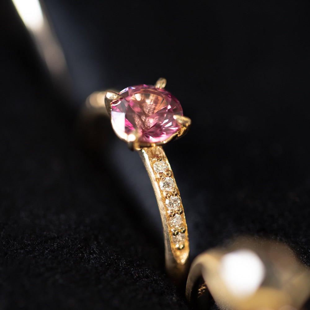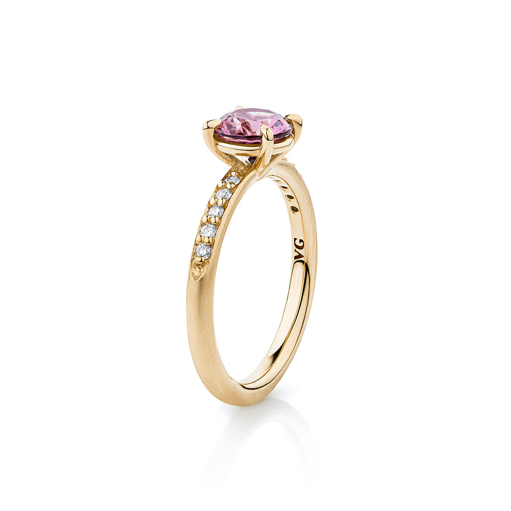 MEET DULCIE, your pink coloured Malaya Garnet and Diamond, 14k Australian Yellow Gold ring. This ring is a solitaire design with the perfect combination of bright colour and additional sparkle.