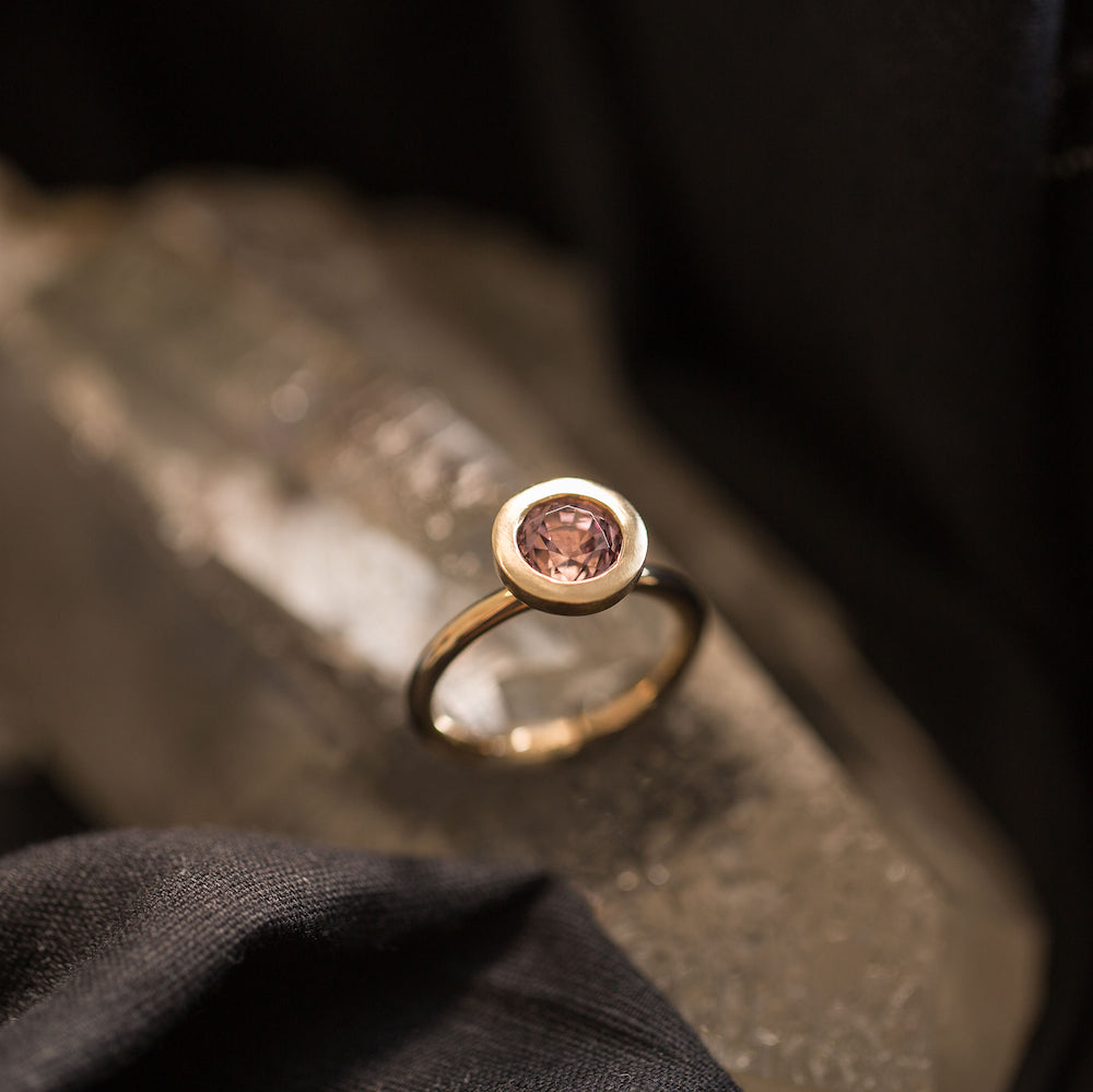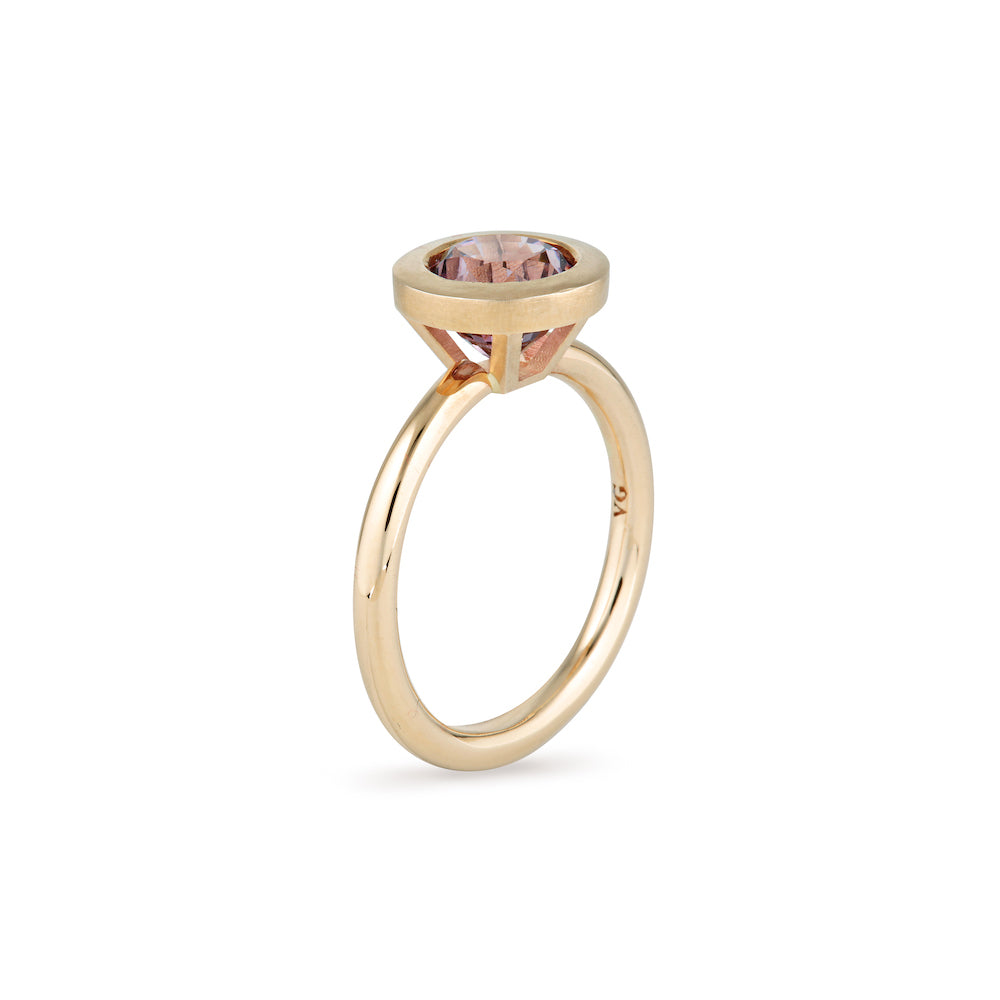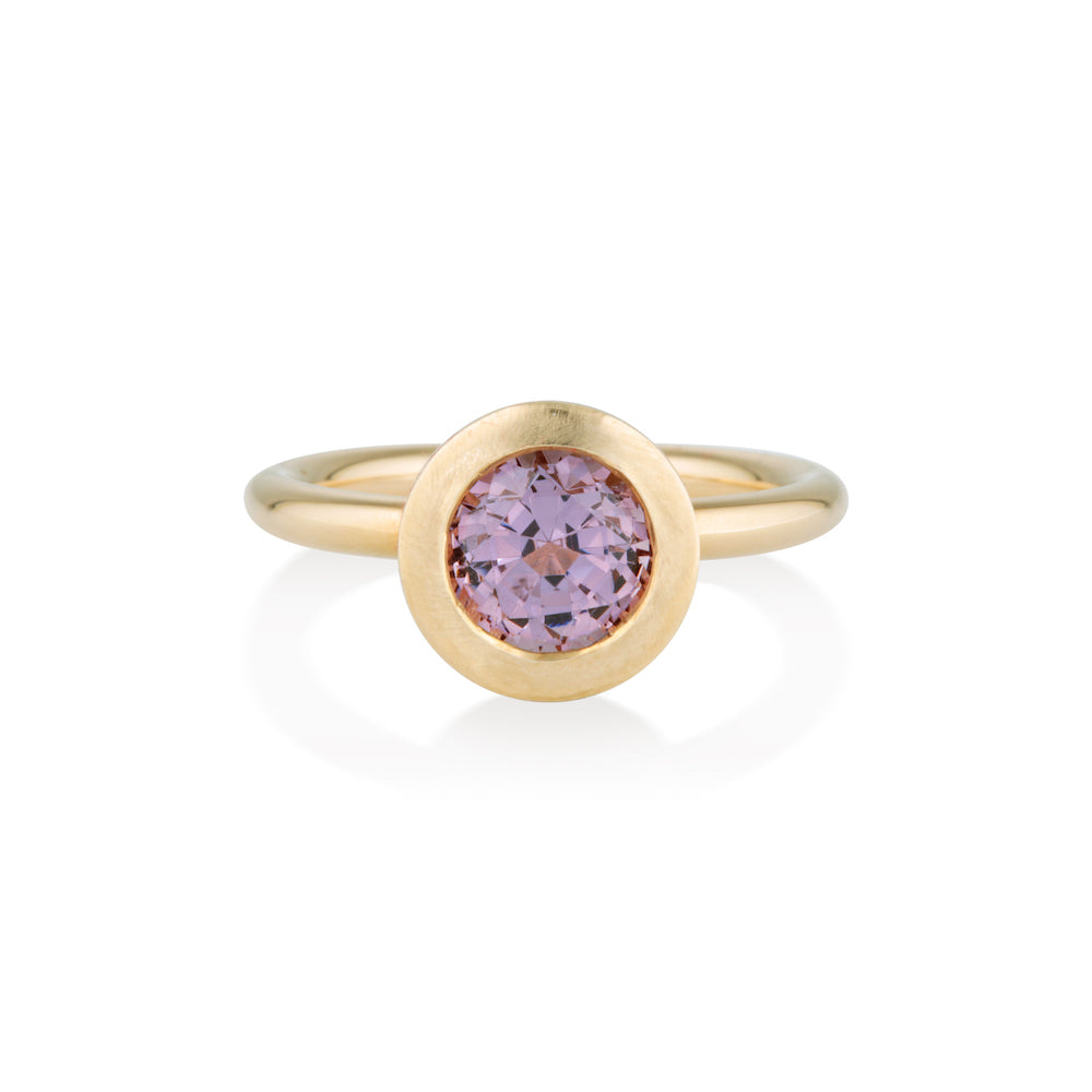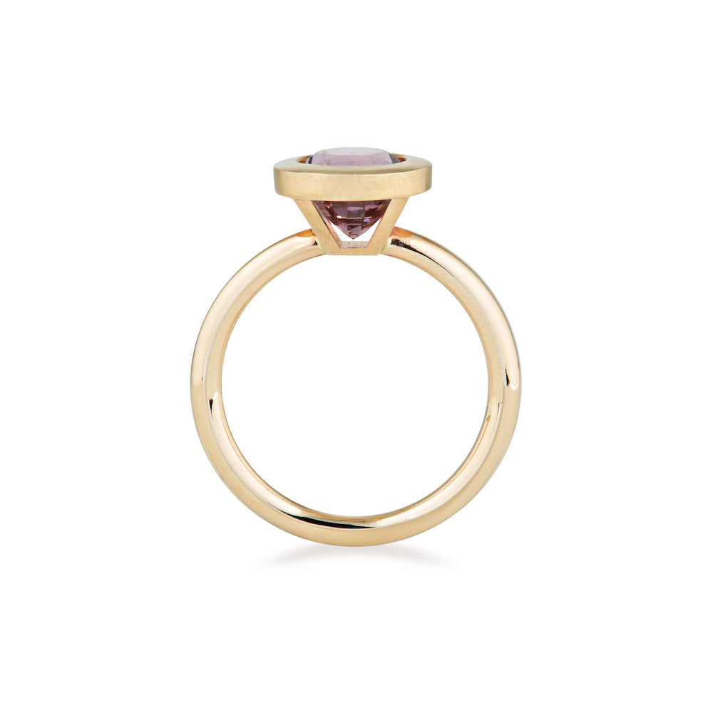 2.02ct mid purplish-pink Spinel surrounded by 14k Yellow Gold. The bezel (lip around stone) is intentionally matte finished and the full round 2mm band is a high shine finish.