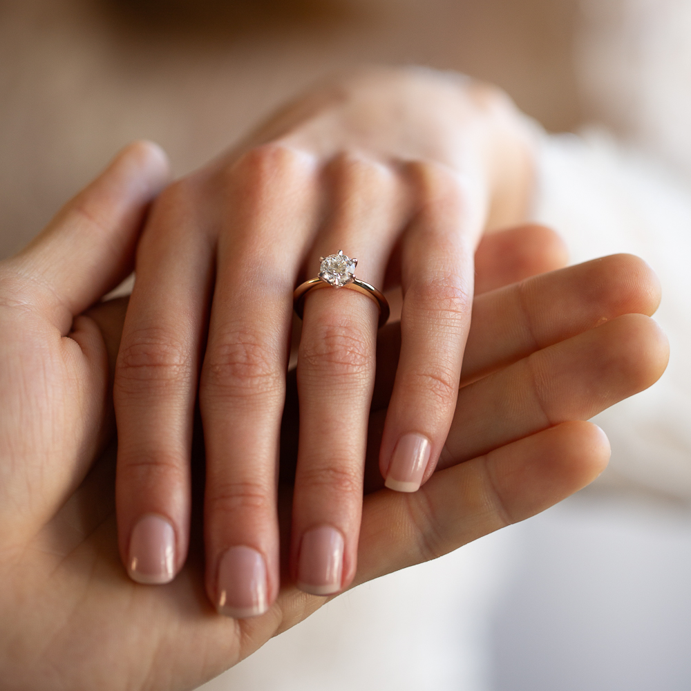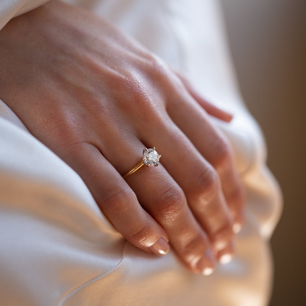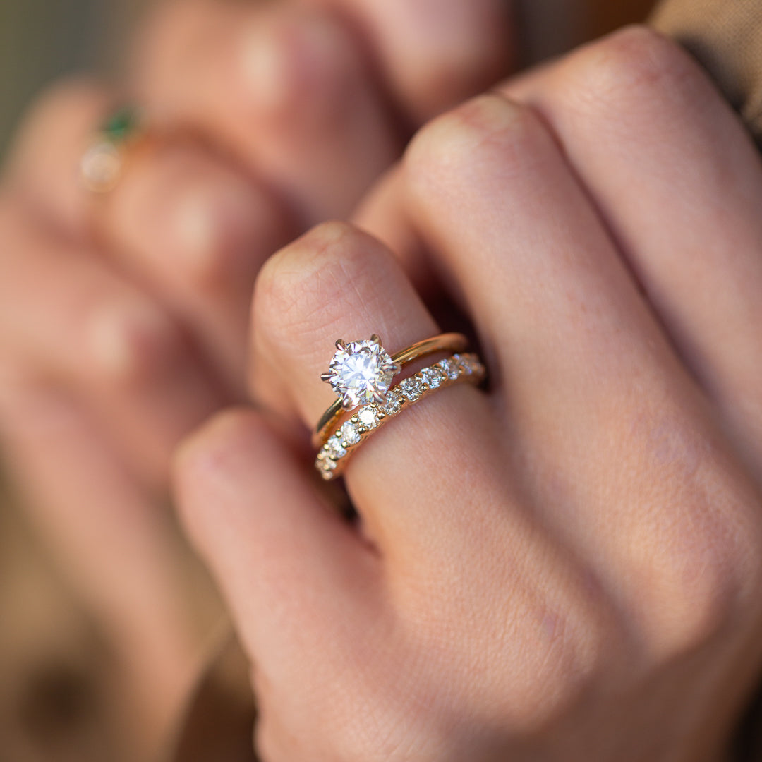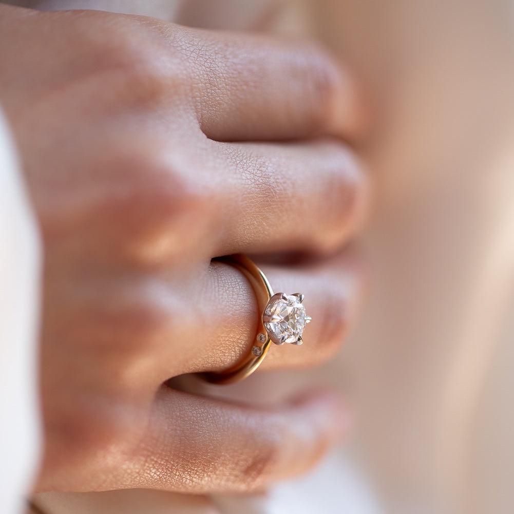 Your Diamond (or Gemstone) of choice will be beautifully showcased in a six-claw basket setting and paired with one of our favourite and signature, softly curved bands. The gently sweeping shoulders of the band provide the perfect height for pairing with a straight or curved wedding band. Two little Diamonds are set into the side of the band, serving as a beautiful reminder of the bond you share.