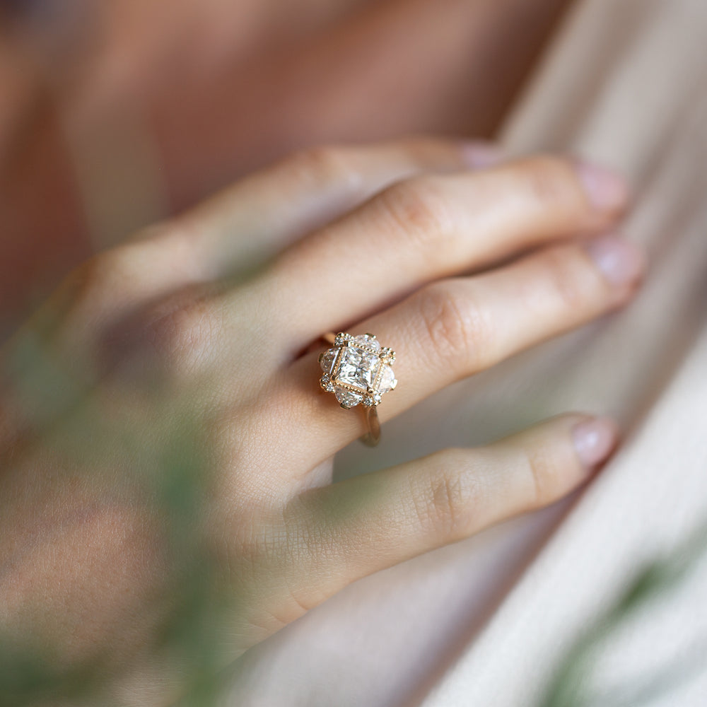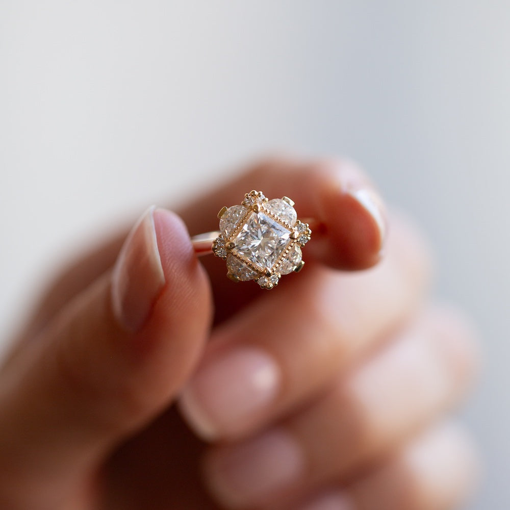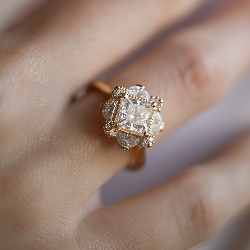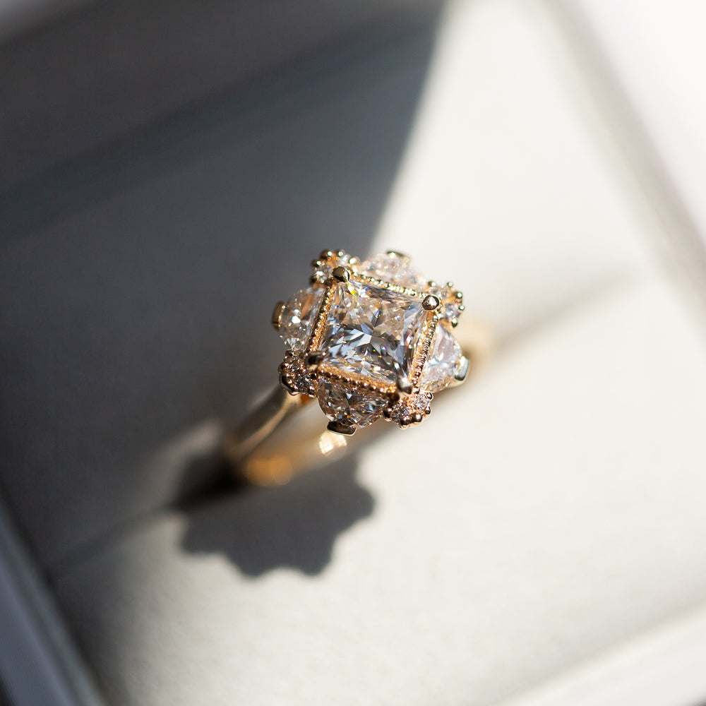 At its heart, the ring showcases a stunning 1.47ct central Princess Cut Diamond, complemented by half moon accents with a total carat weight of 1.2ct.