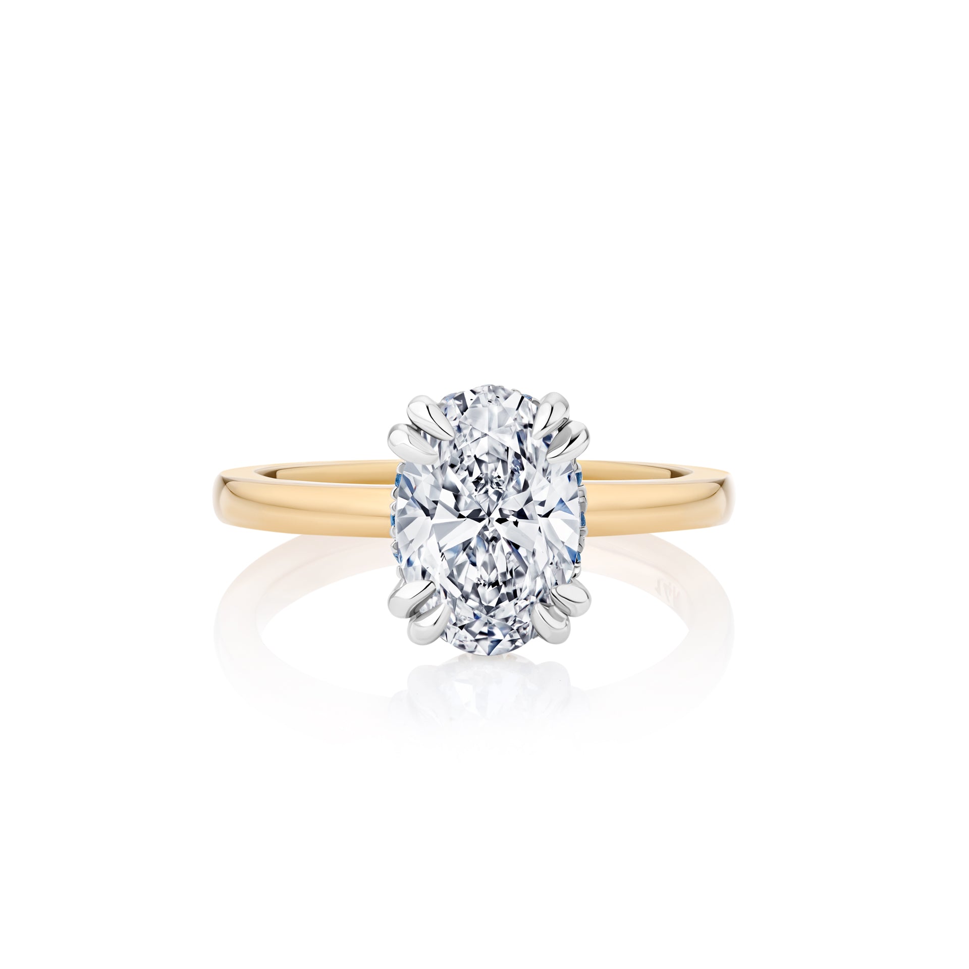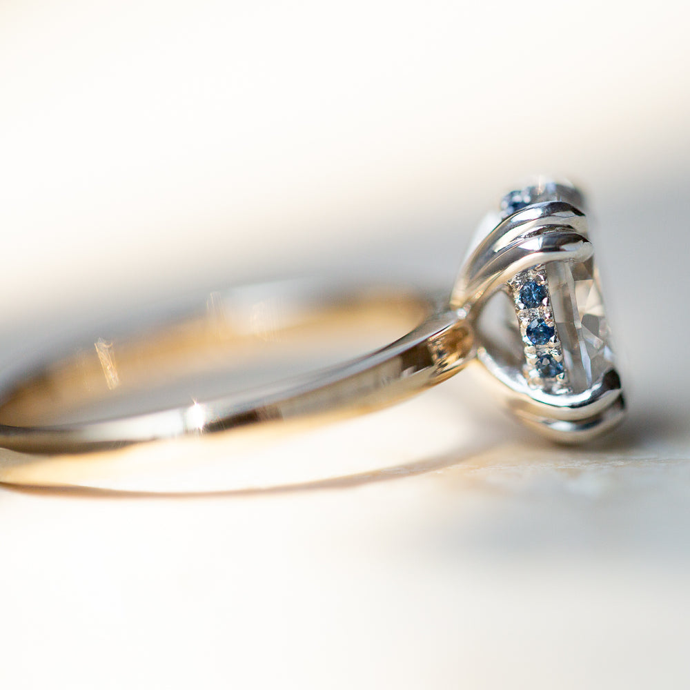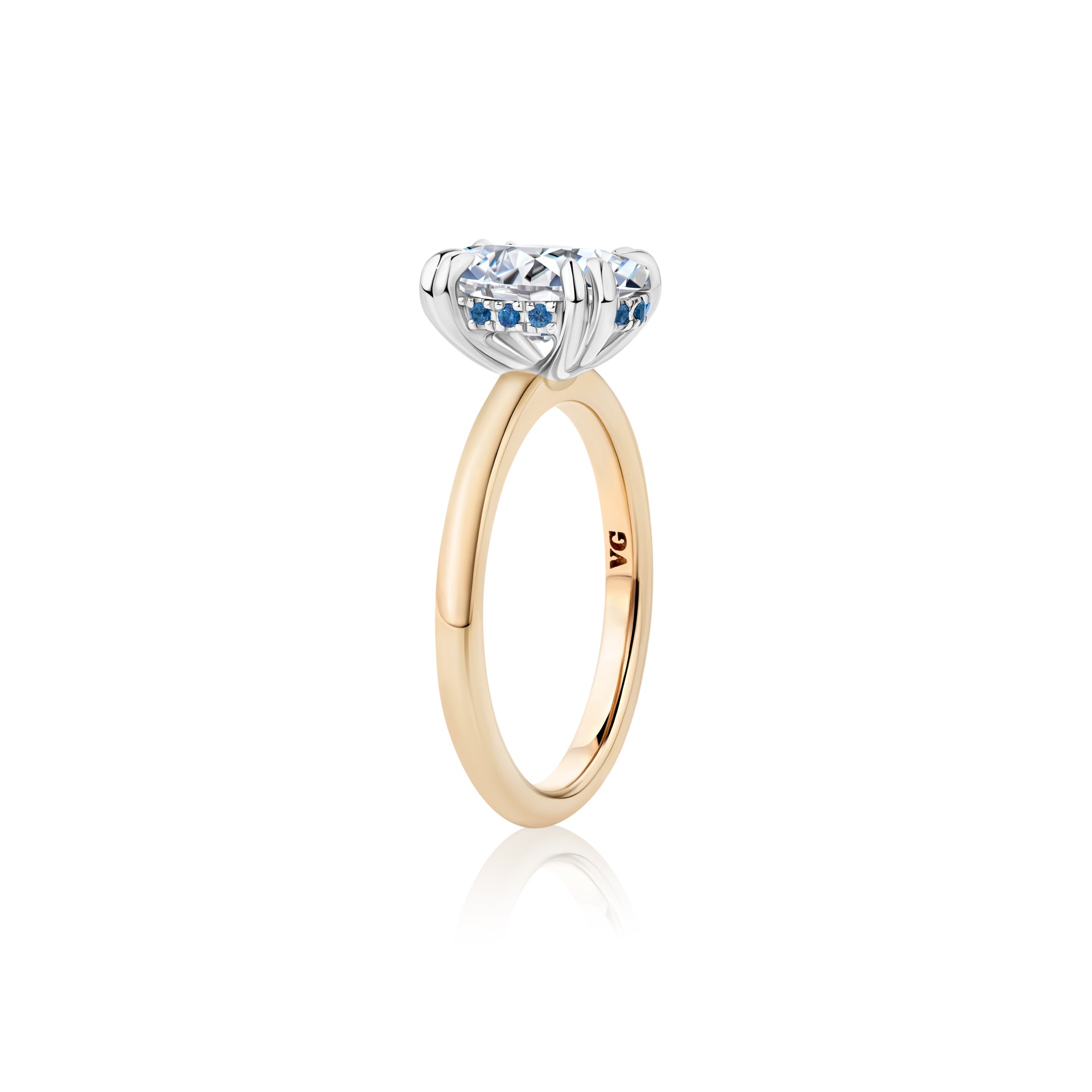 Your Diamond will be hand-selected and beautifully showcased in an eight-claw Platinum setting, complemented by a classic Yellow Gold band. The gracefully sweeping shoulders of the band create the ideal height for pairing with either a straight or curved wedding band. Surrounding the central stone, twelve meticulously set Australian Blue Sapphires add a distinctive and captivating detail to this exquisite piece.