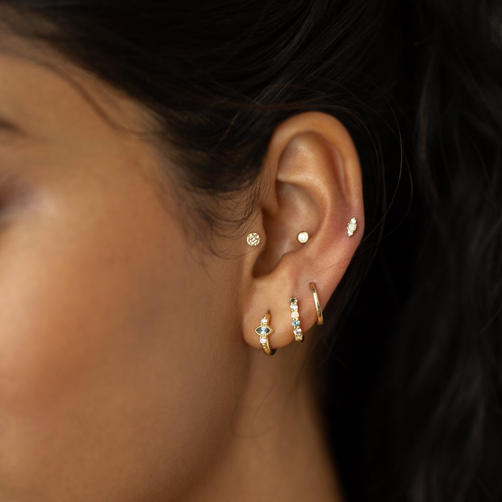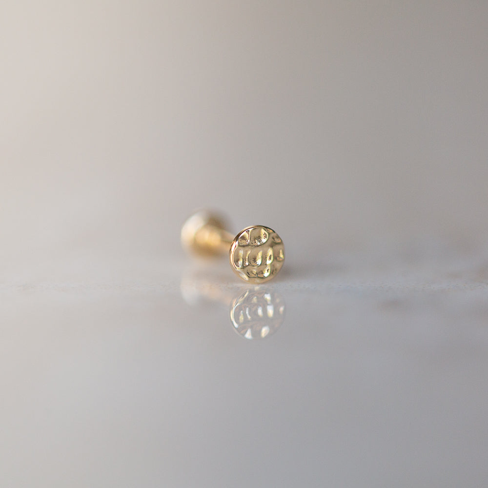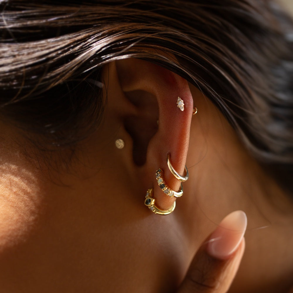 The Eden Piercing Earring is sculpted in solid 14k Yellow Gold, its surface softly irregular and textured which makes it feel organic and reflective.