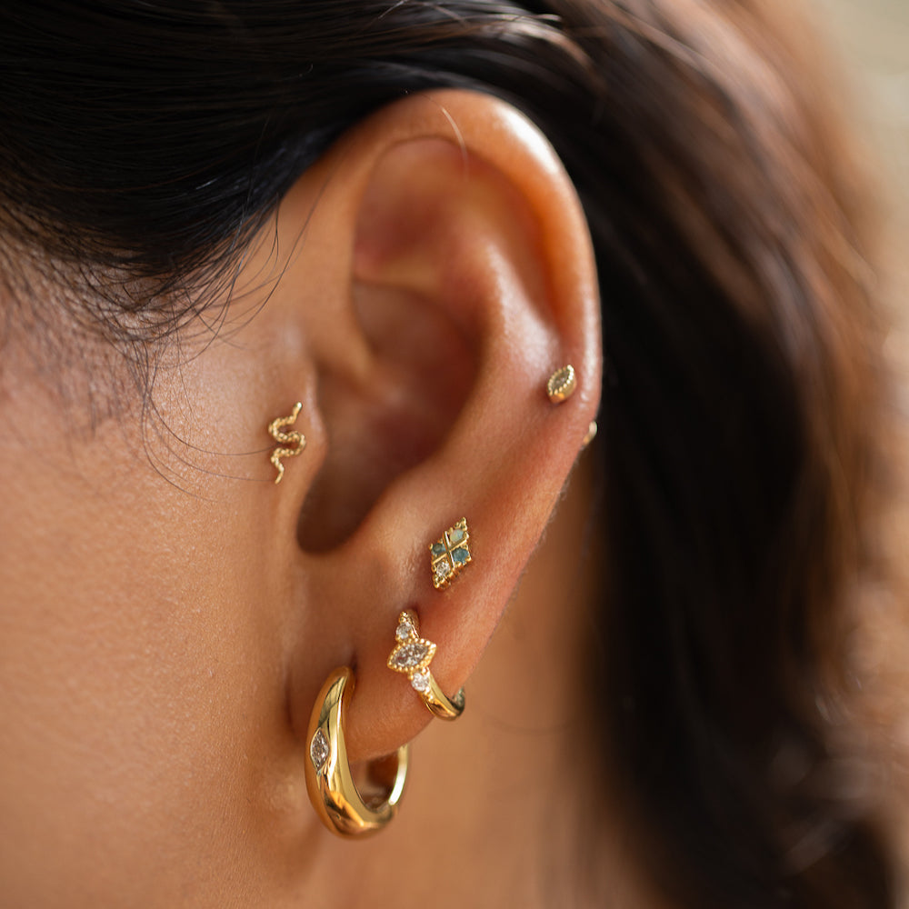 • 5 mm — a close, refined fit ideal for thin lobes, upper lobes, or forward helix piercings where minimal post length creates a seamless look.