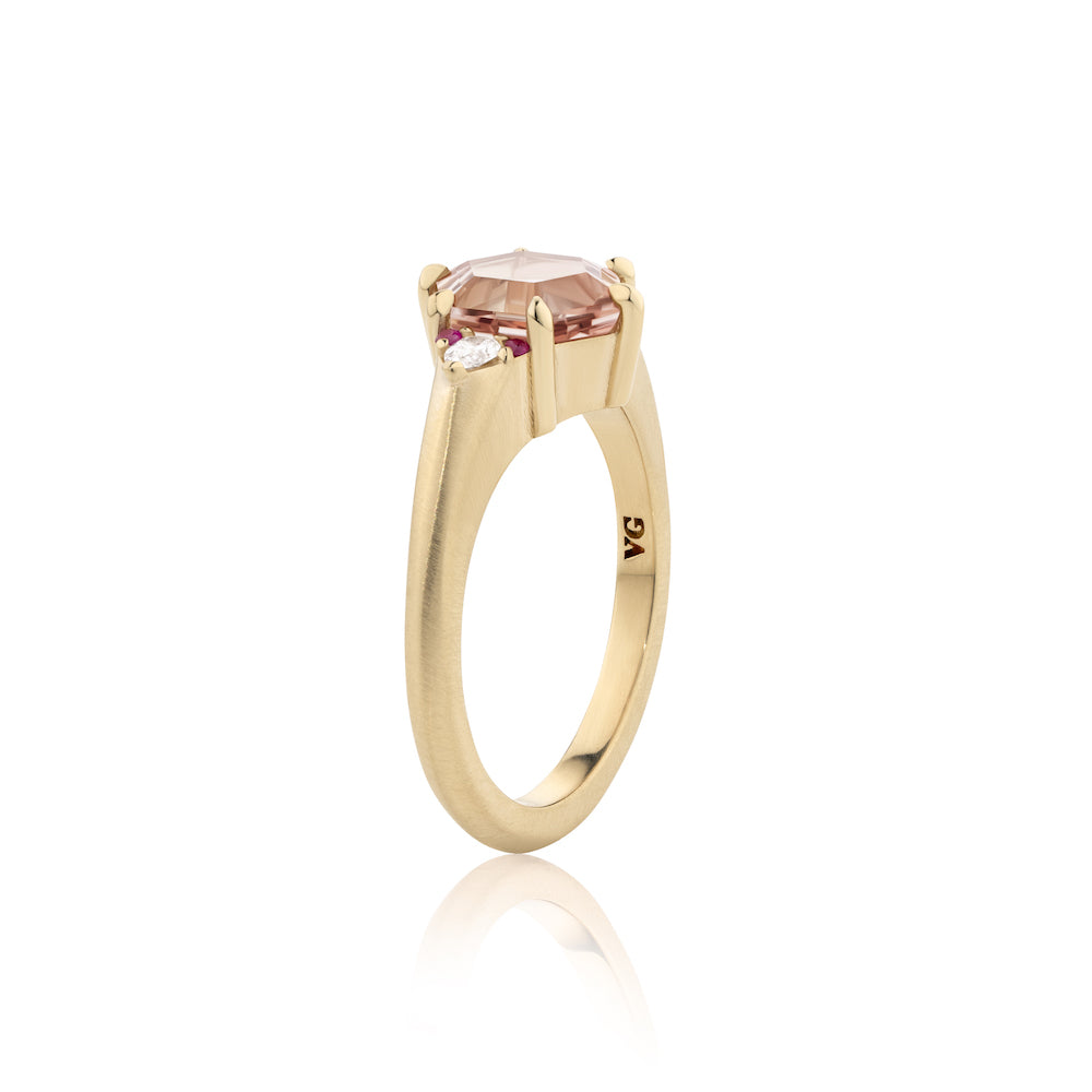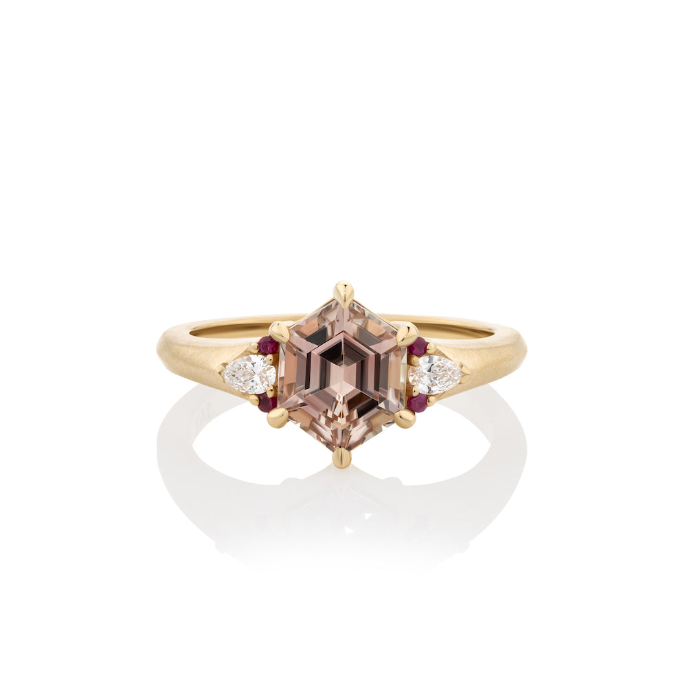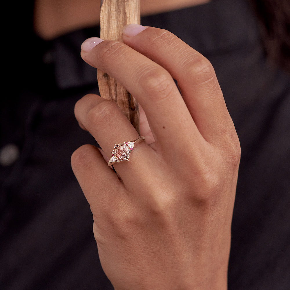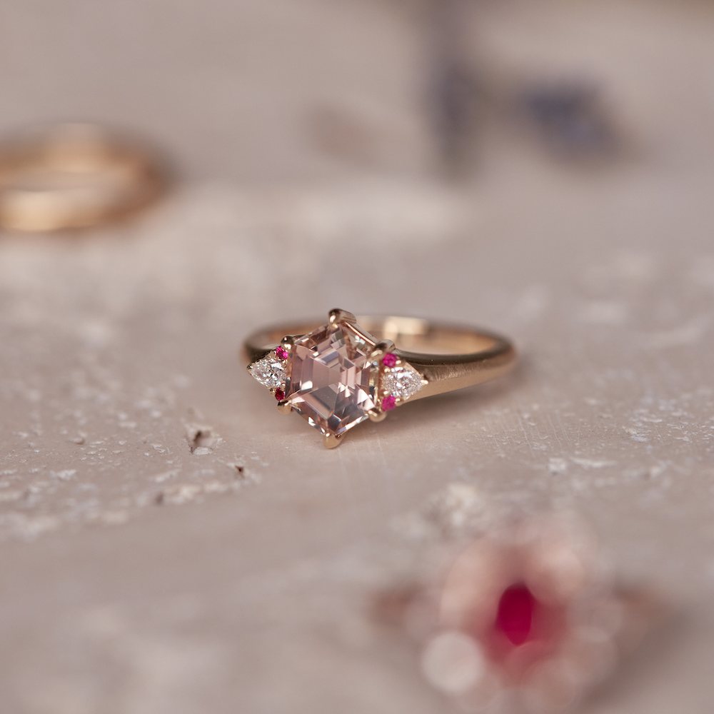 The FENJA ring embodies a contemporary and robust aesthetic, showcasing a hexagonal 1.59ct light pink Bicolour Tourmaline. It has been intentionally accented with symmetrical detailing ~ White Diamond and deep pink Rubies either side to elevate the colours and shape of the central, unique gemstone.