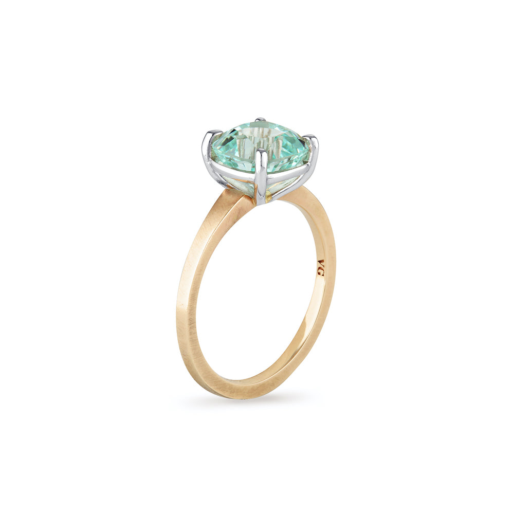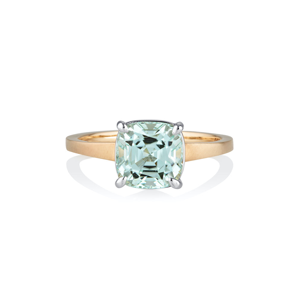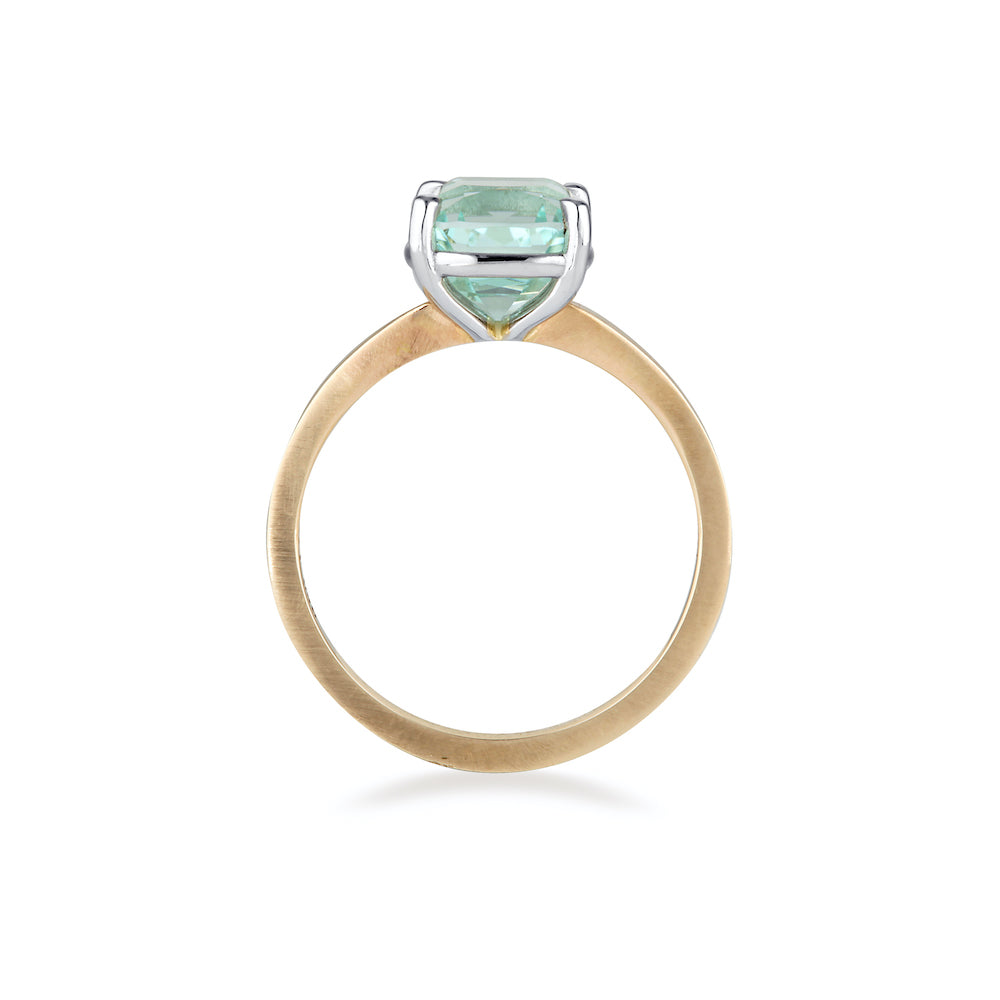 The 2.24ct square cushion cut Ice Blue Tourmaline has been intentionally set into Platinum, to allow the brightness of this enthralling stone to POP. The band created contrast with the lightly brushed, 14k Yellow Gold (reverse tapered) band.