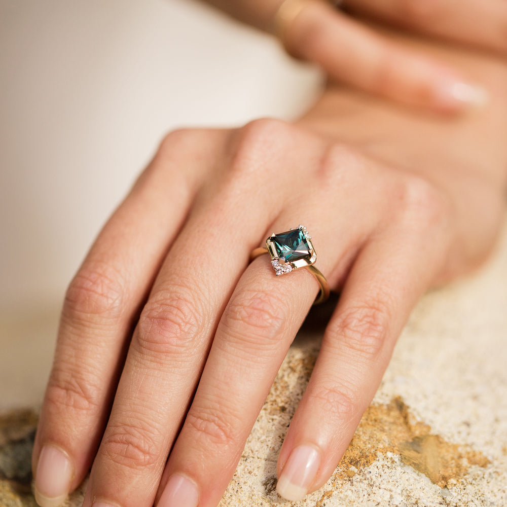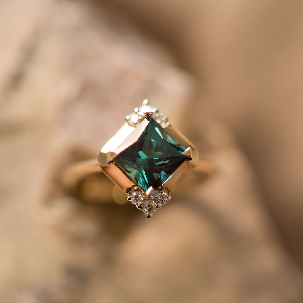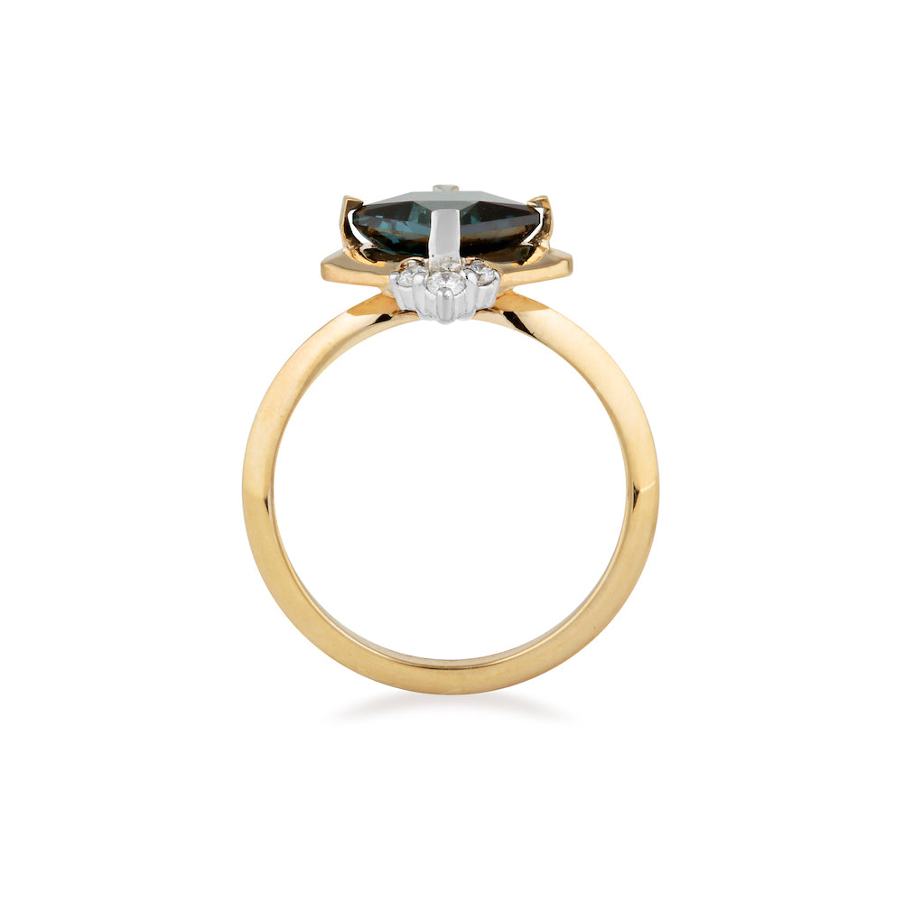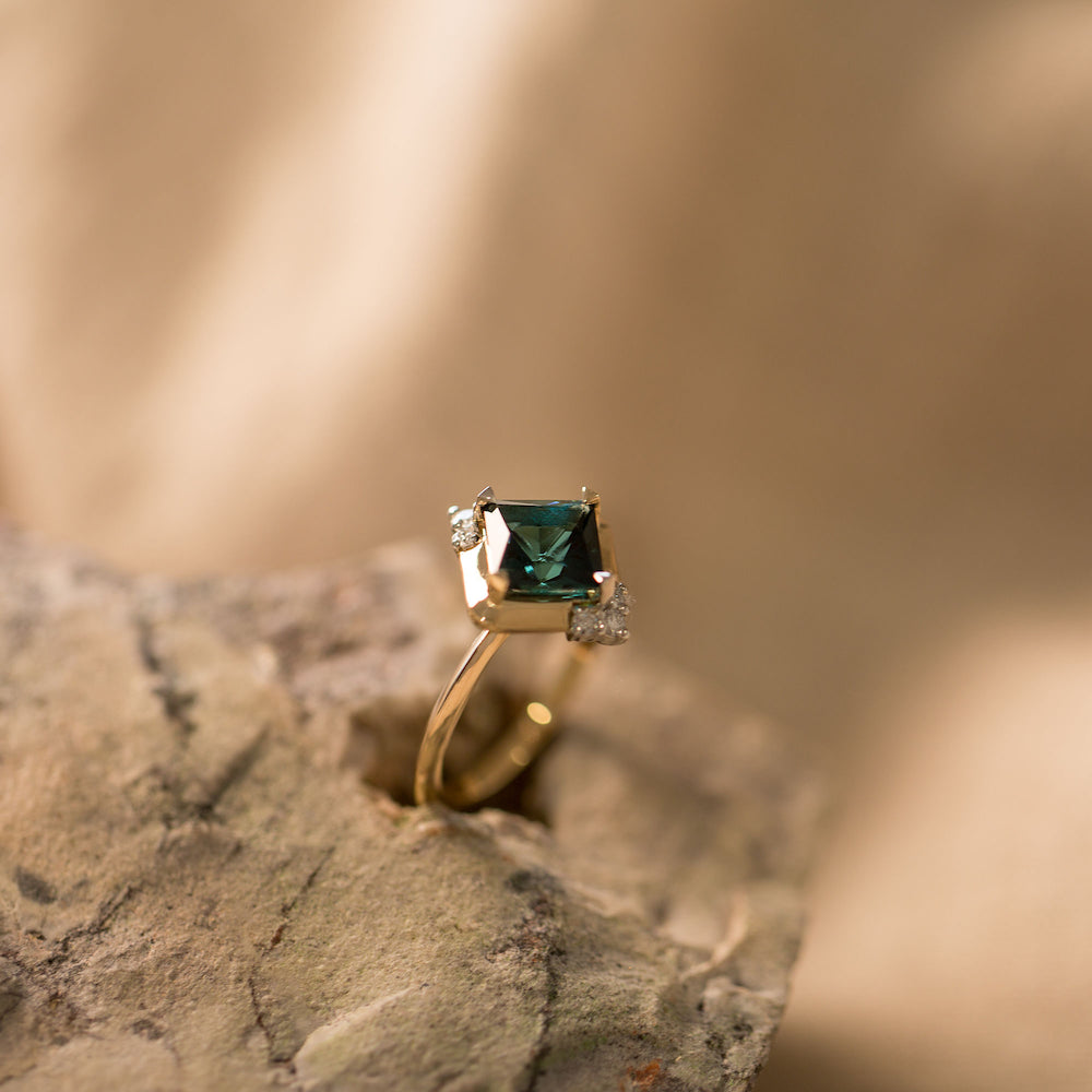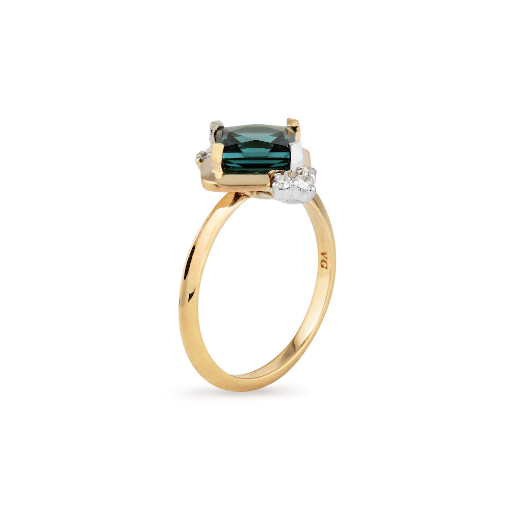 This ring is inspired by an era of glamour and sophistication. She not only feels elegant and timeless on the hand, but also like she has lived there for lifetimes. She is a modern Art Deco inspired design combining a vibrant, geometric 1.62ct Indicolite Tourmaline, with Diamond detailing and a mixed 14k White and 14k Yellow Gold.