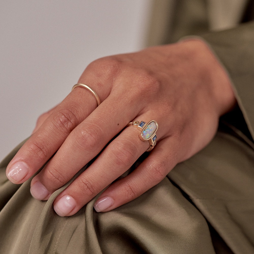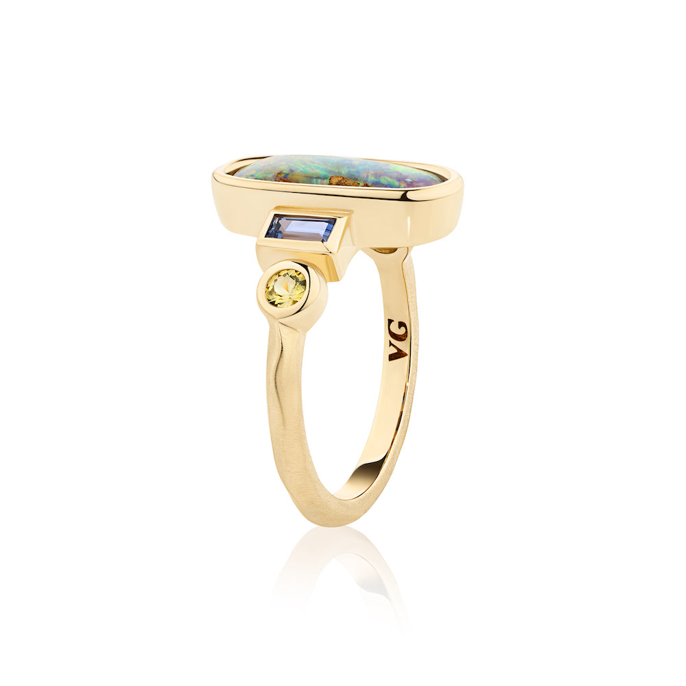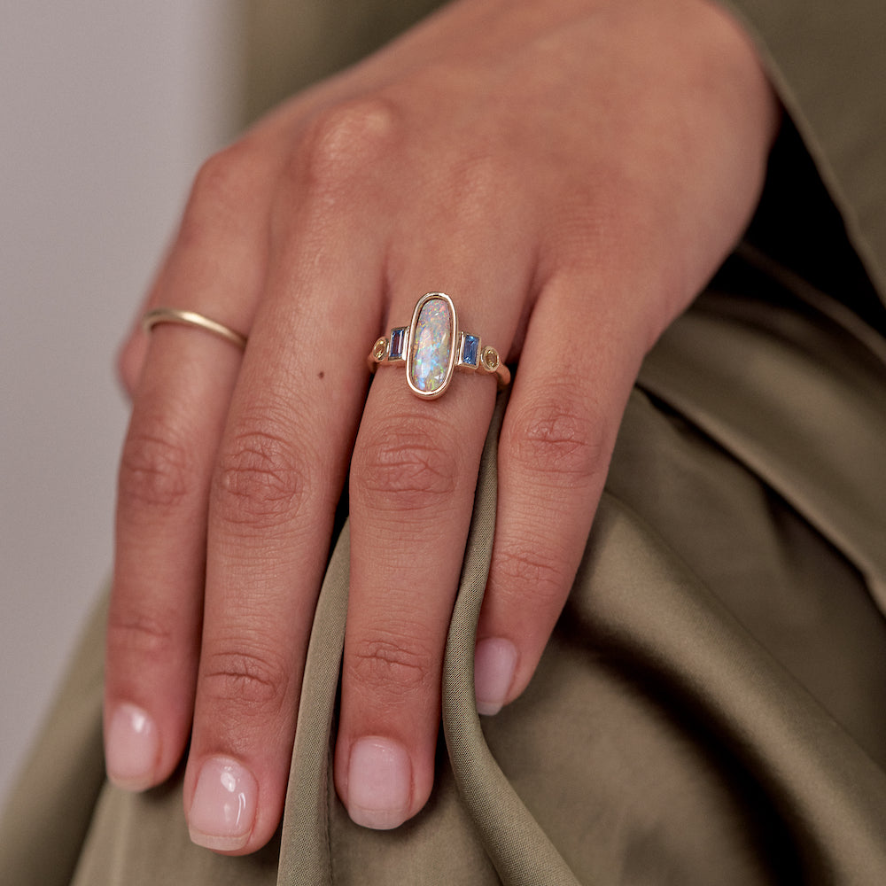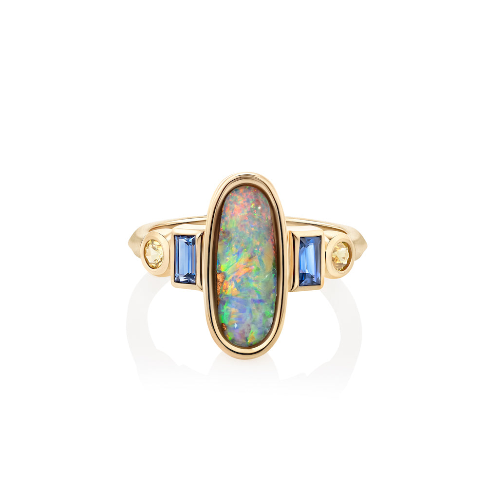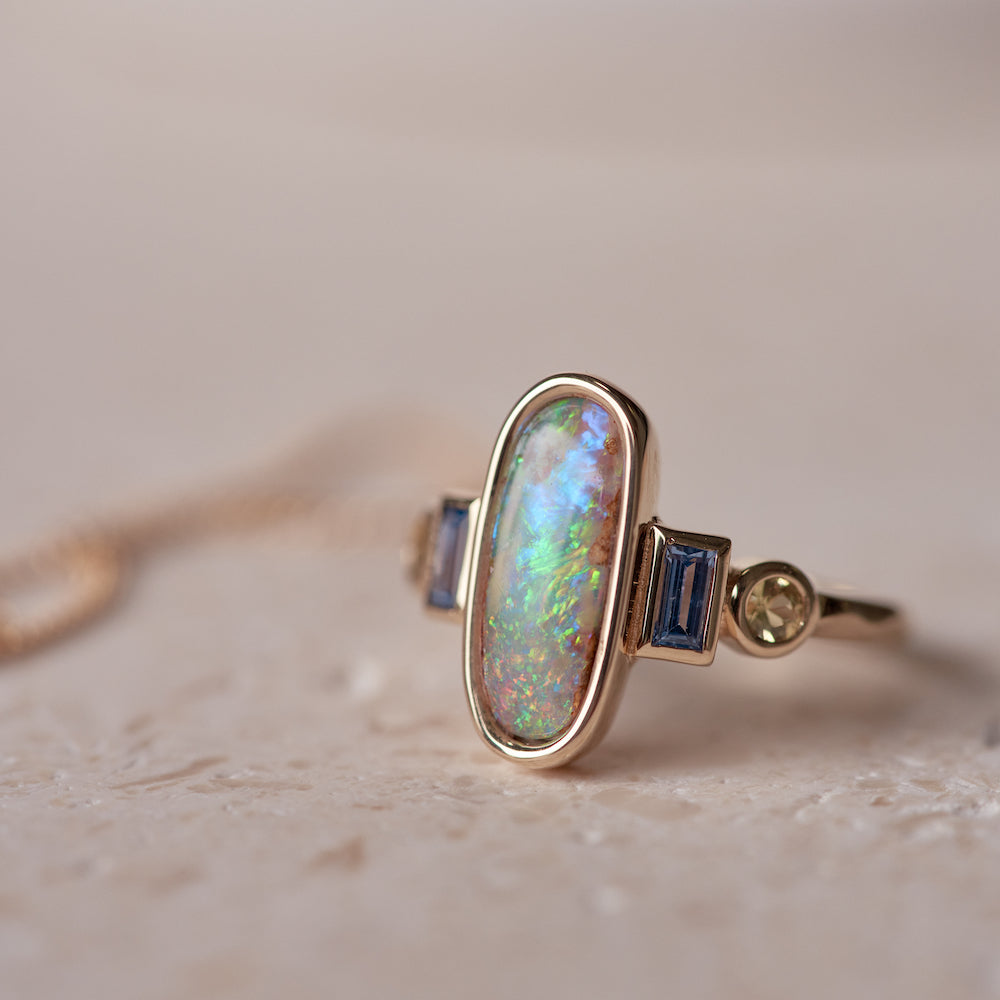 The Aurora ring showcases an Australian Boulder Opal that is securely nestled within a custom bezel setting, which not only protects the Opal but also allows its unique beauty to take centre stage. The Opal is framed by Blue & Yellow Sapphires of varied shapes, which creates a colourful and angular contrast.