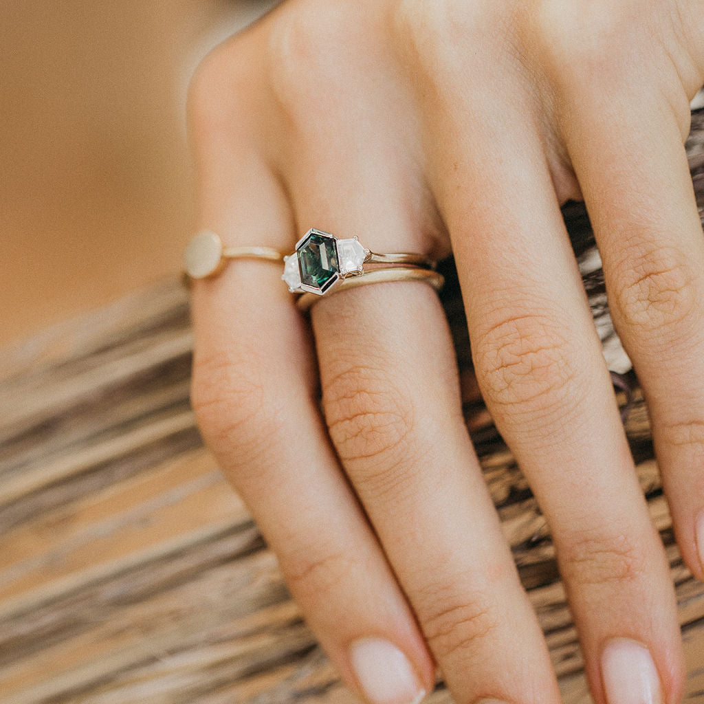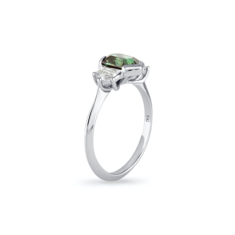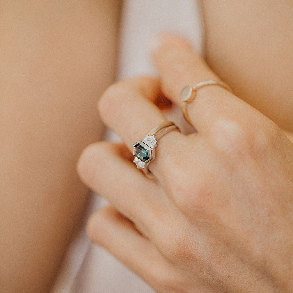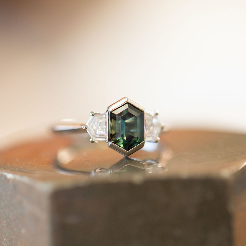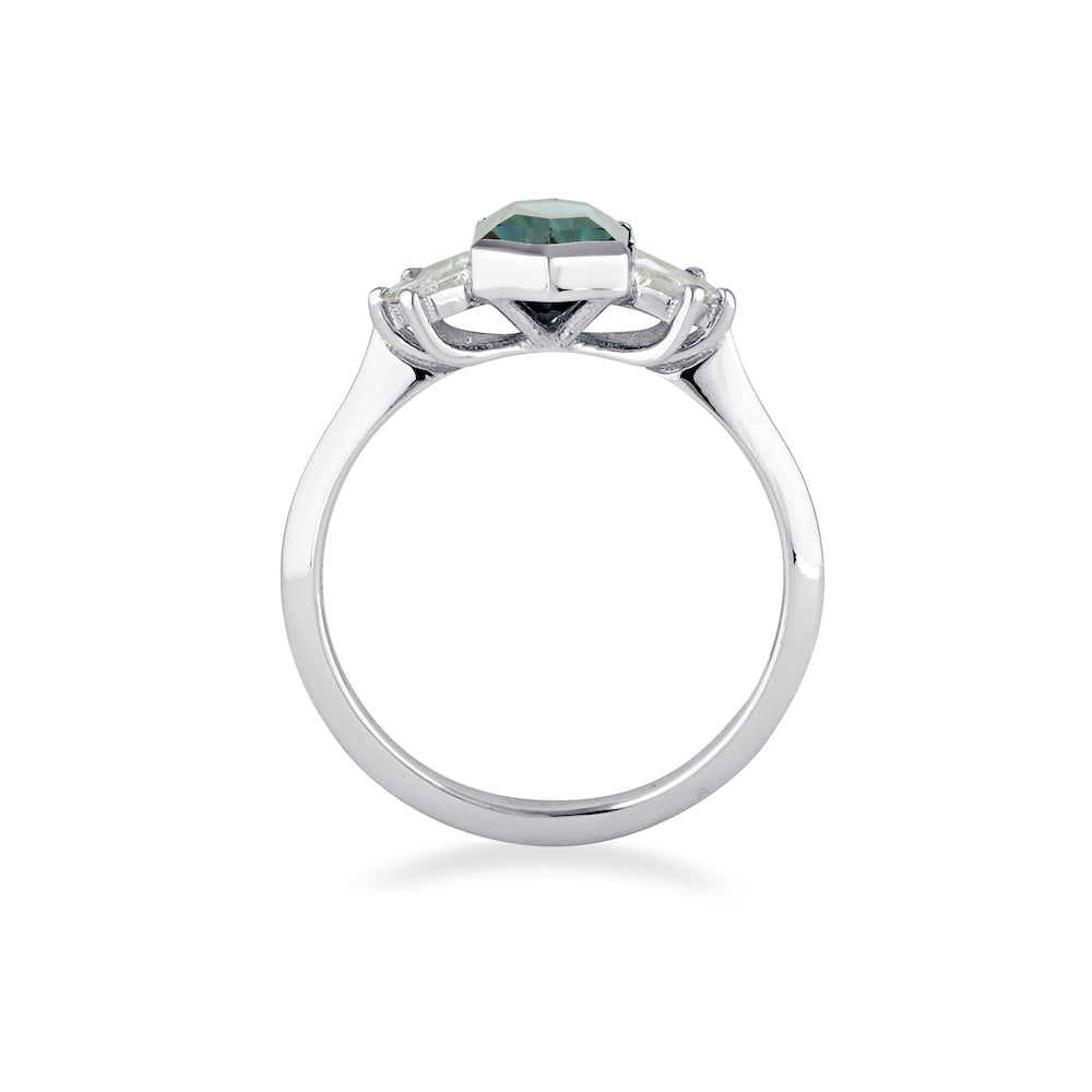 This 1.44ct elongated Hexagonal Australian Sapphire, Cadillac Diamond and Platinum ring is a bold design that makes a statement… when seen on the hand she is strong, distinctive and impressive.
