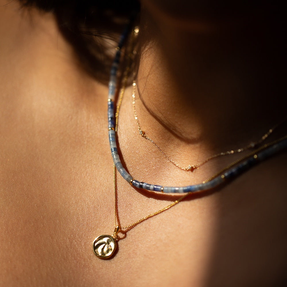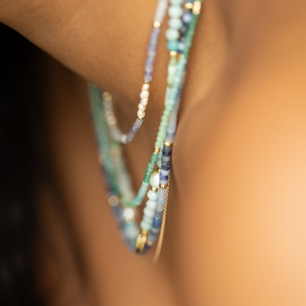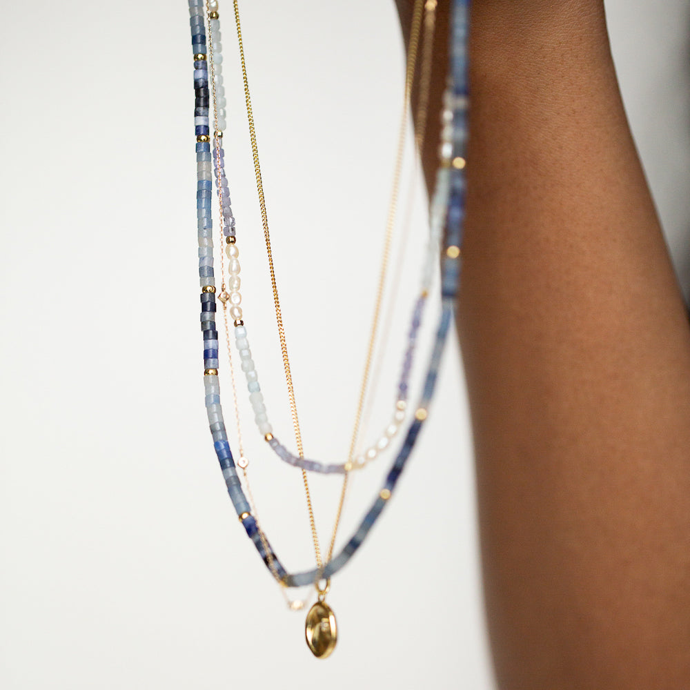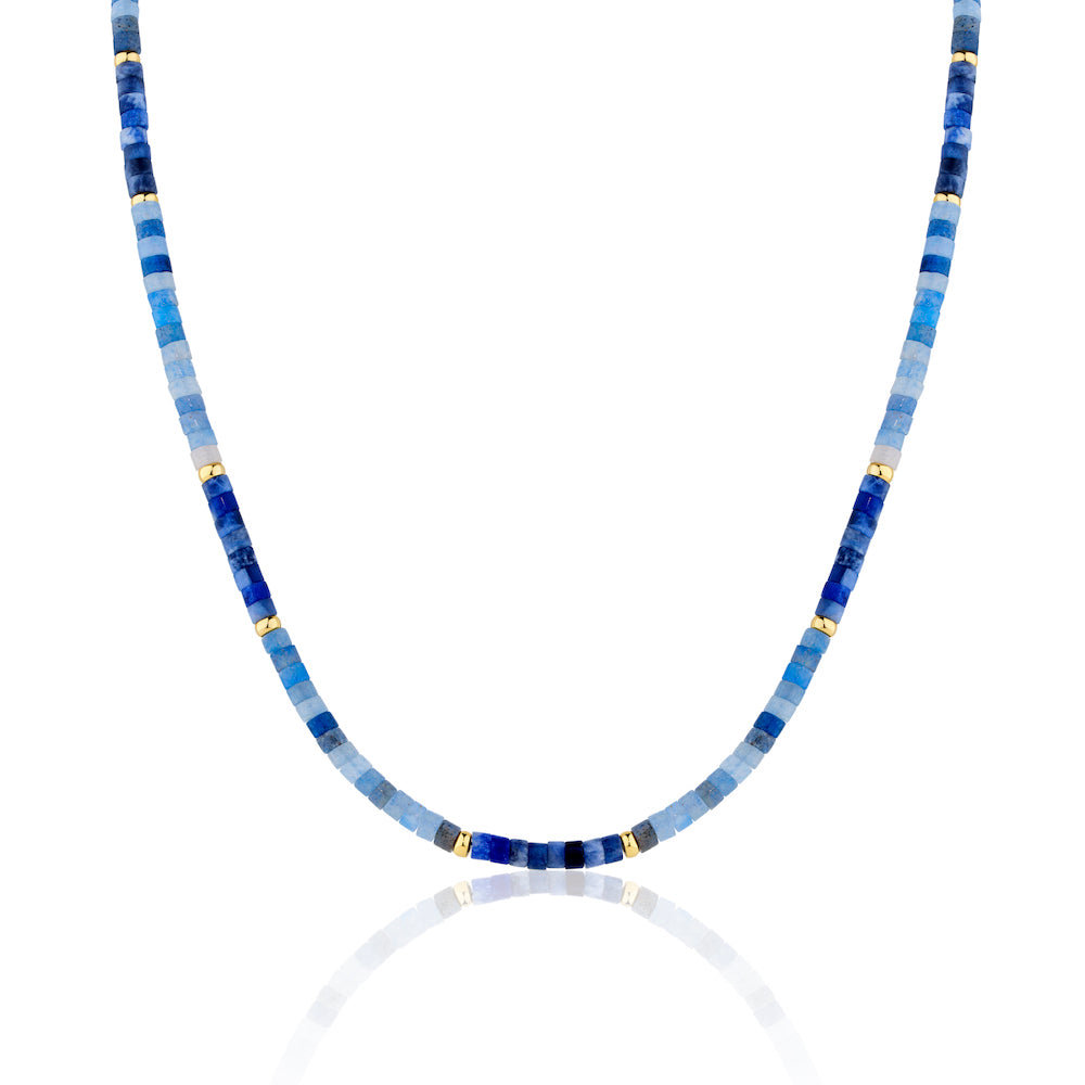 Our new Aven Beaded Necklace pairs Sodalite and Blue Aventurine Gemstones ~ naturally forming hues that shift between the colours of the ocean and sky. Finished with fine 14k Yellow Gold Vermeil detailing.