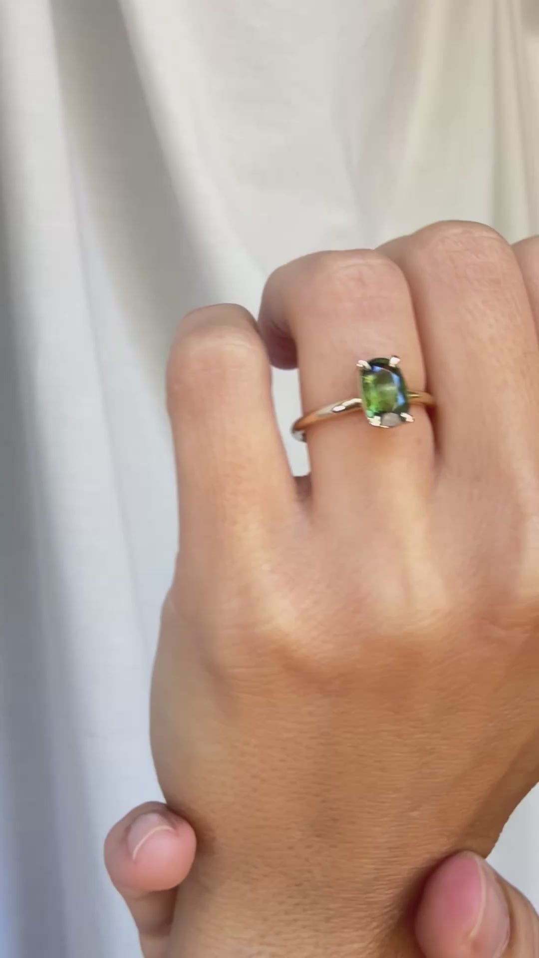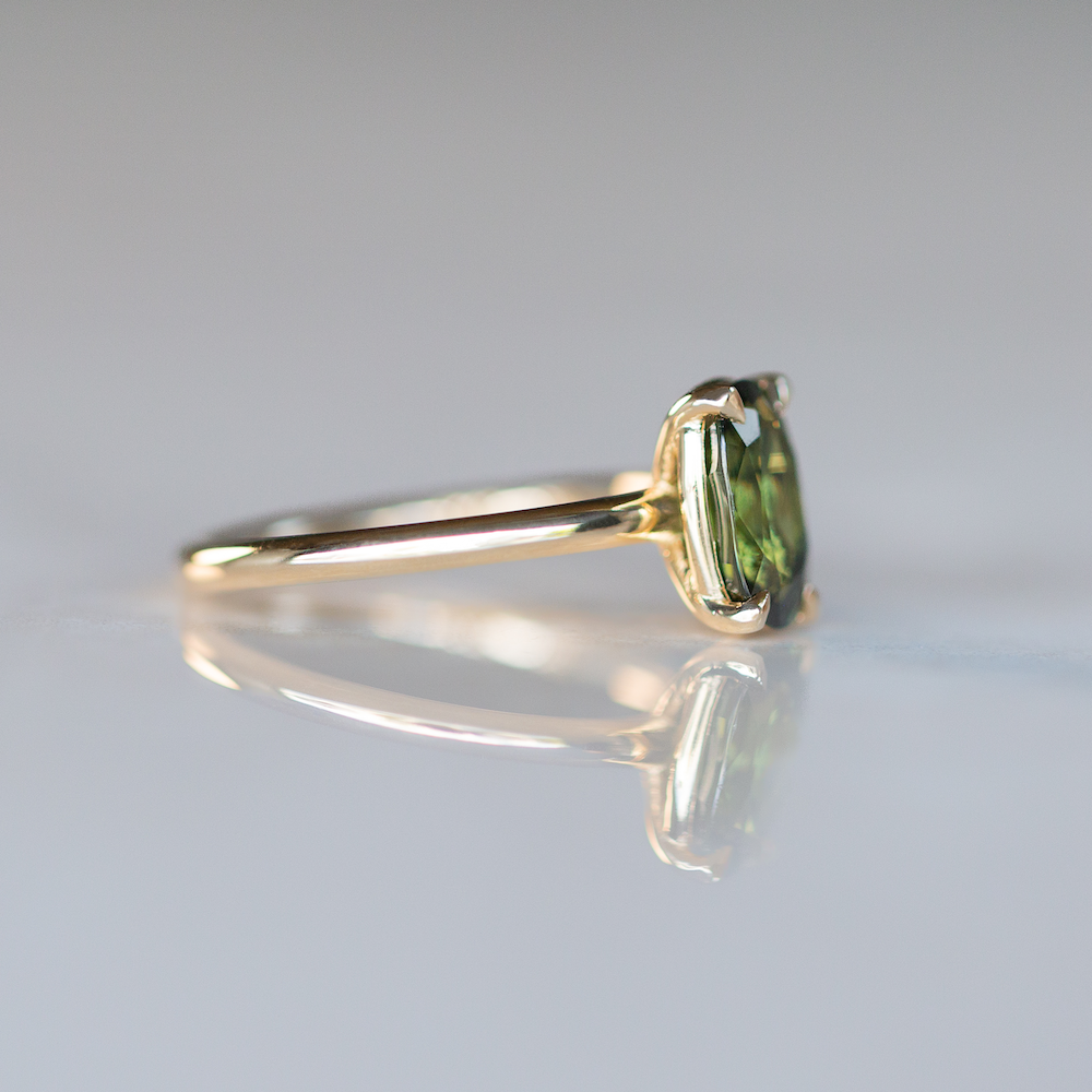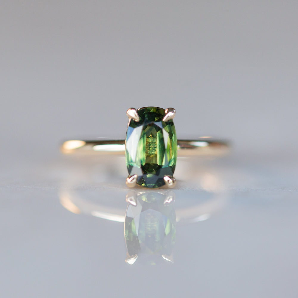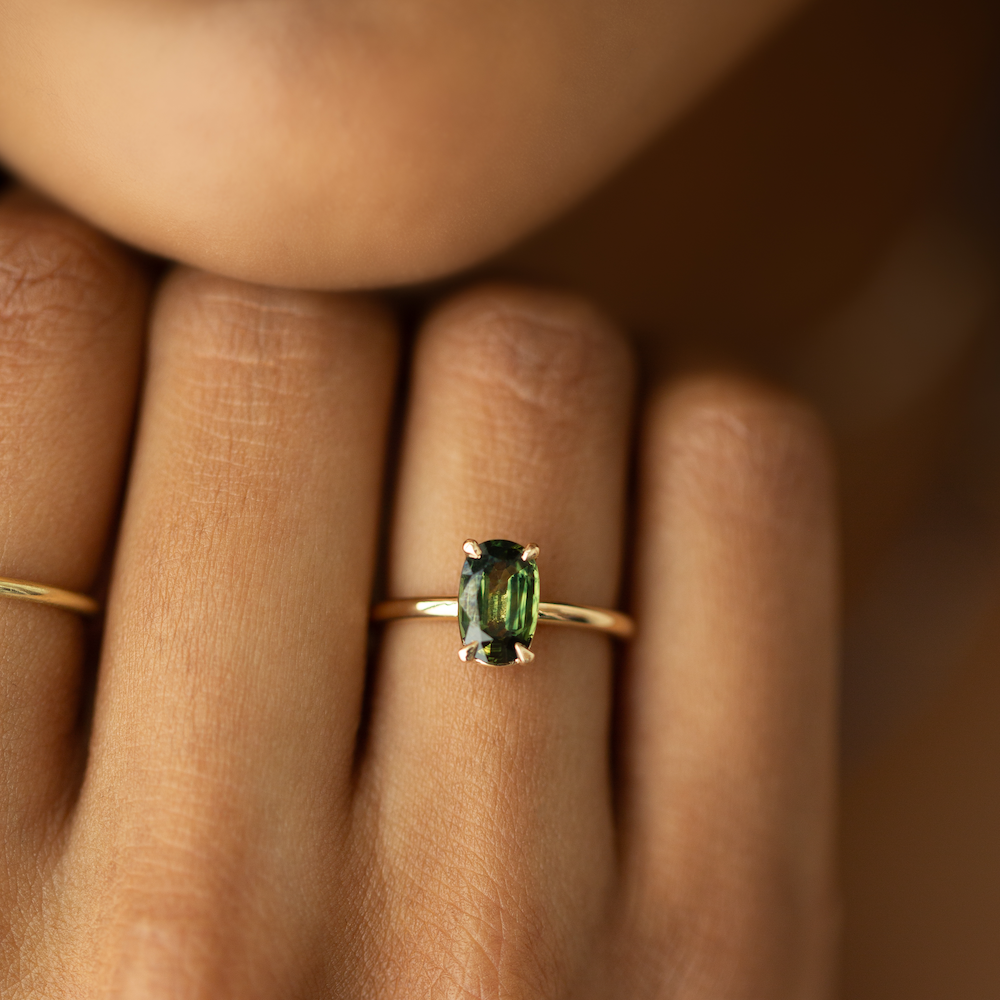 Meet our Jedda design – our signature solitaire, this variation reimagined with a 1.65ct natural Australian Green Sapphire. This heirloom gem was mined and cut back in ’71/’72, then tucked away in a little black box in a safe for over 50 years. Until now...