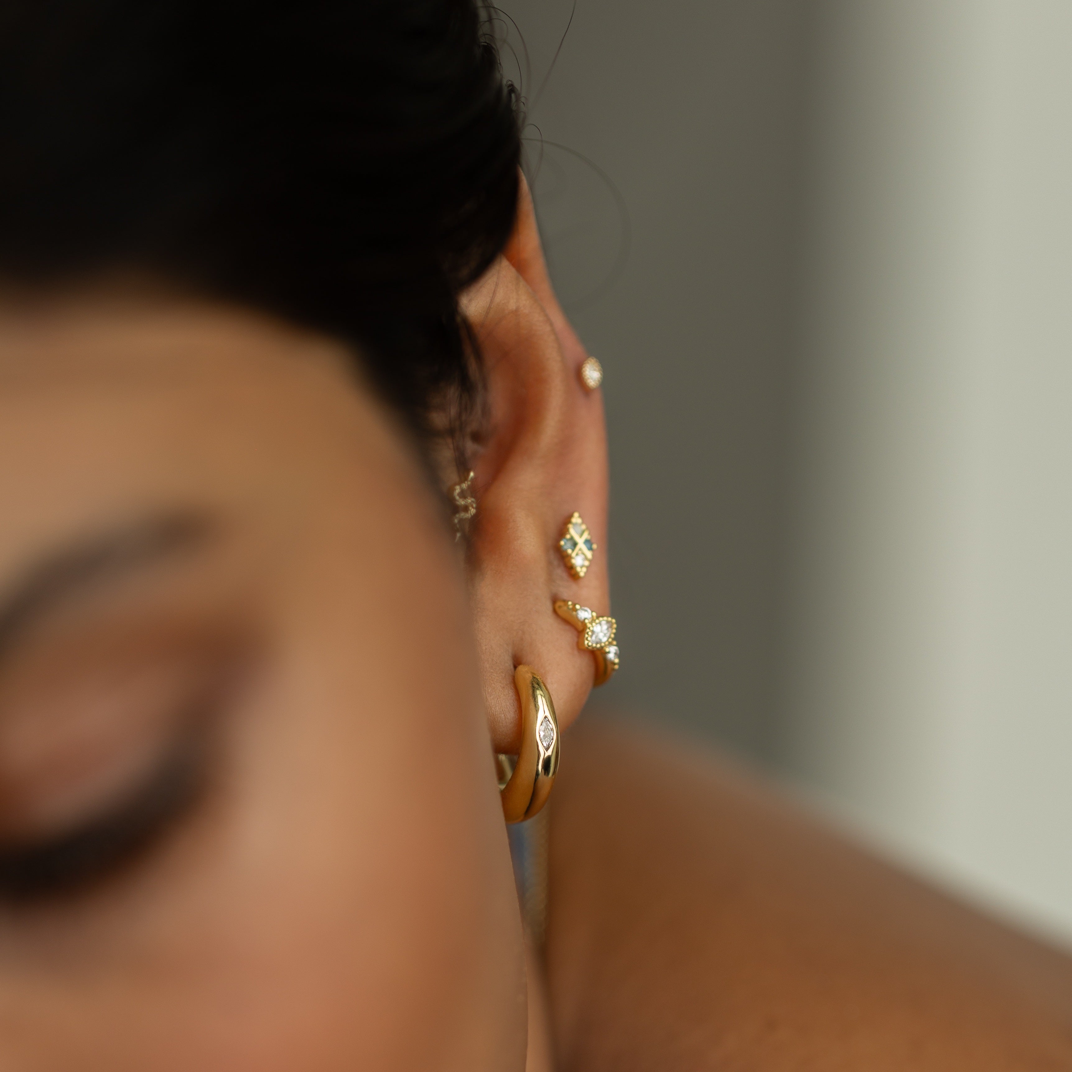 Softly radiant and thoughtfully proportioned, this design brings quiet structure and shimmer to your ear stack — refined, versatile, and luminous by design.