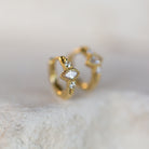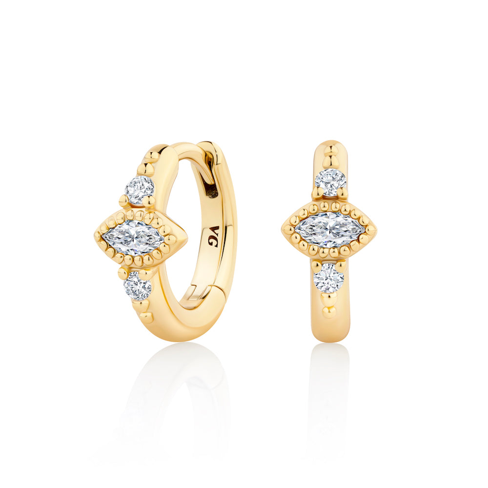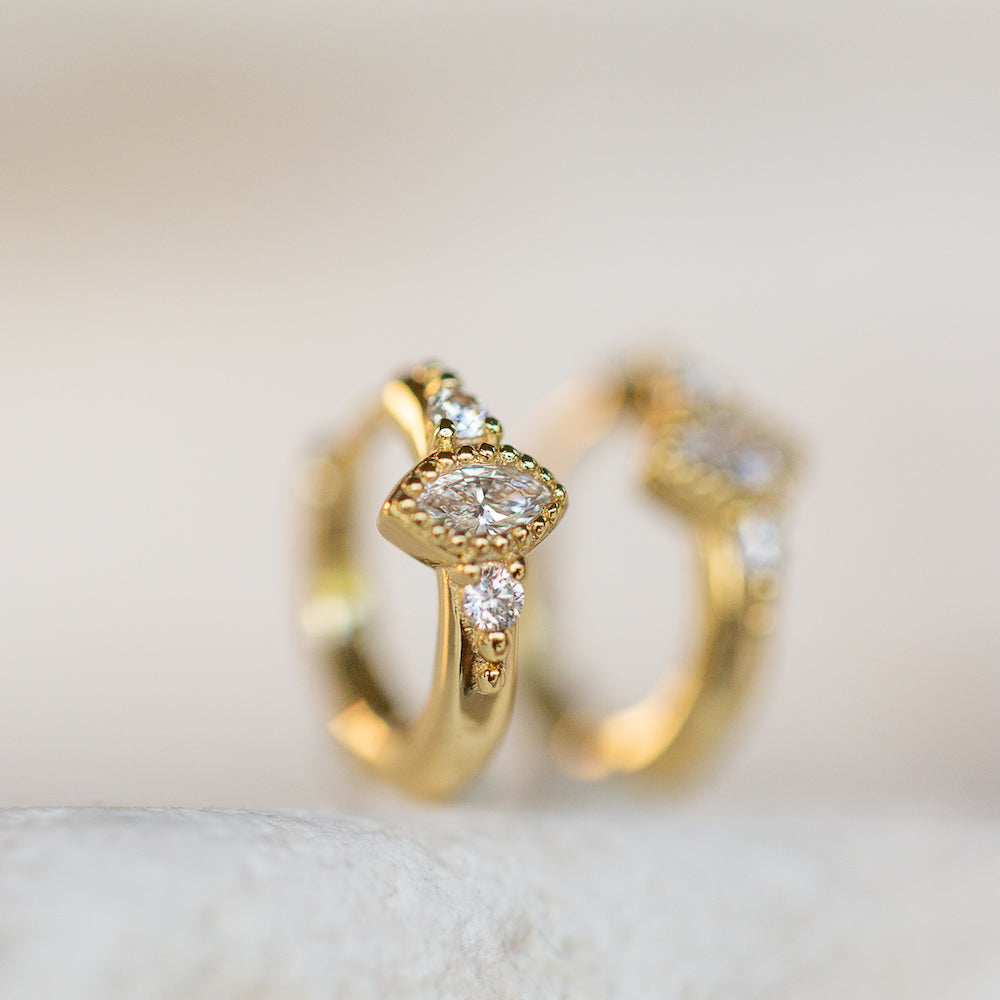 The Ayea Huggies feature a marquise-cut Lab-grown White Diamond framed by delicate gold beading and two smaller round Diamonds poised above and below for perfect balance and light.