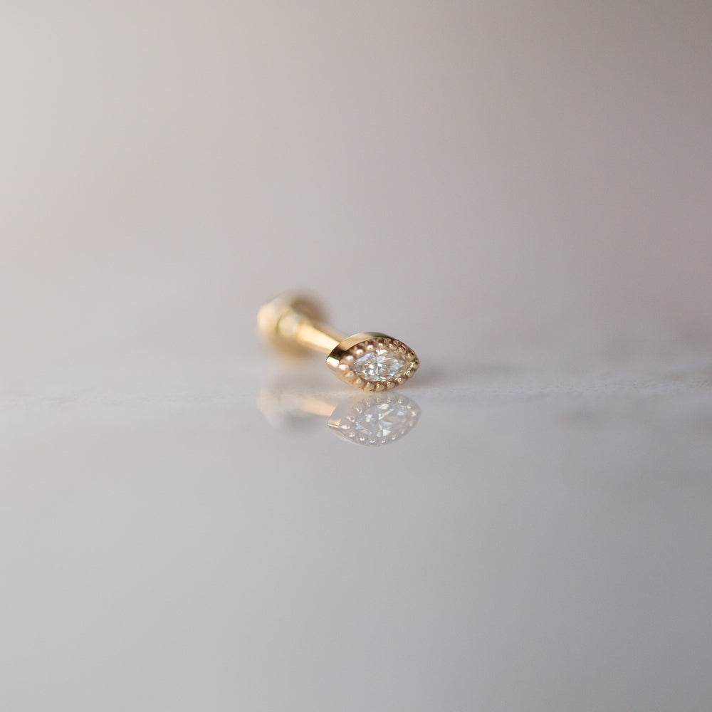 The Mira Piercing Earring features a Marquise-cut, Earth-grown White Diamond framed in a fine milgrain bezel ~ a delicate balance of precision and softness.