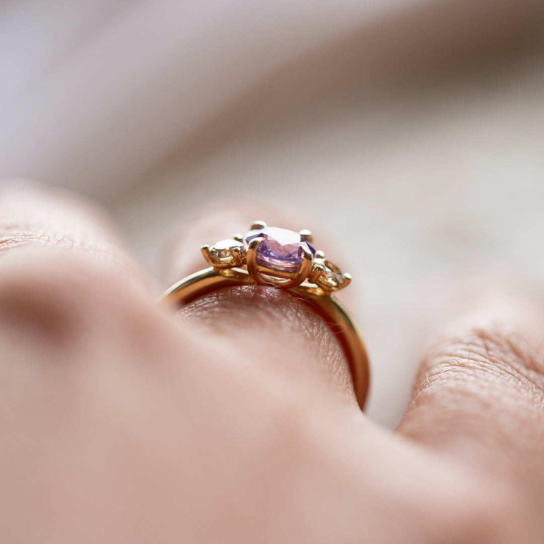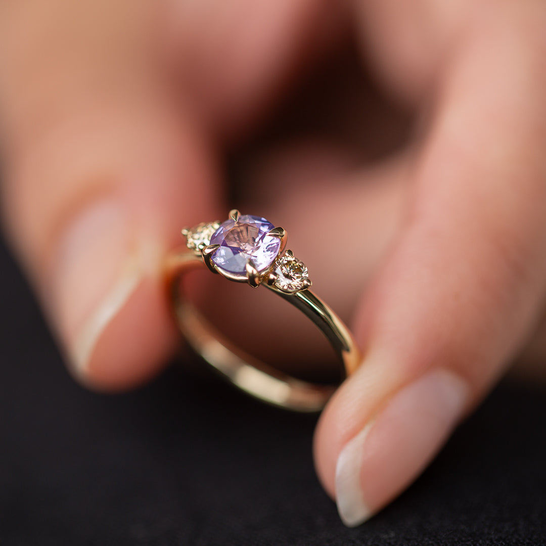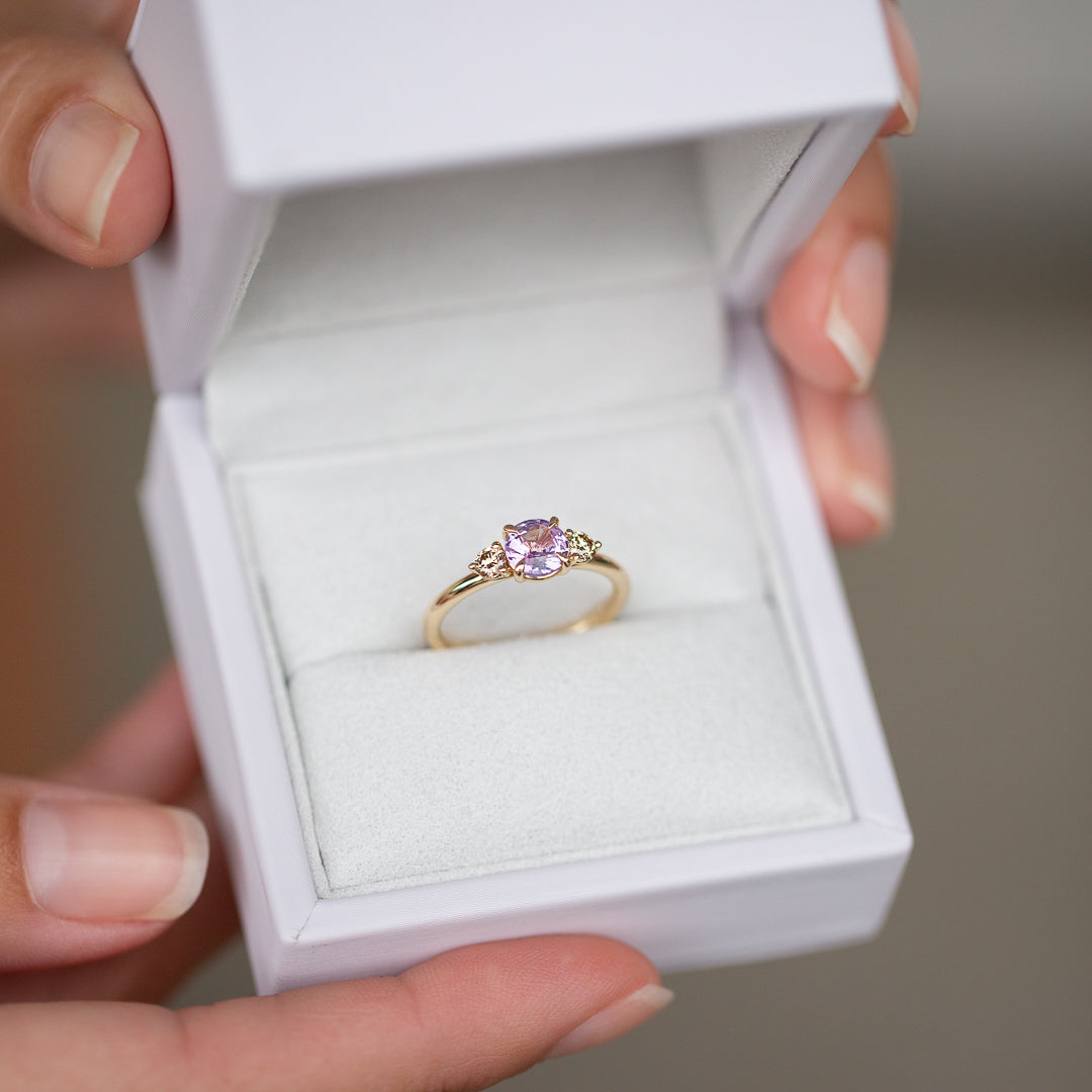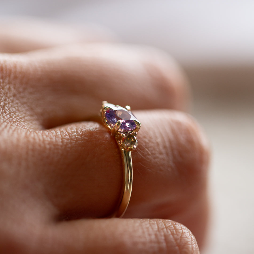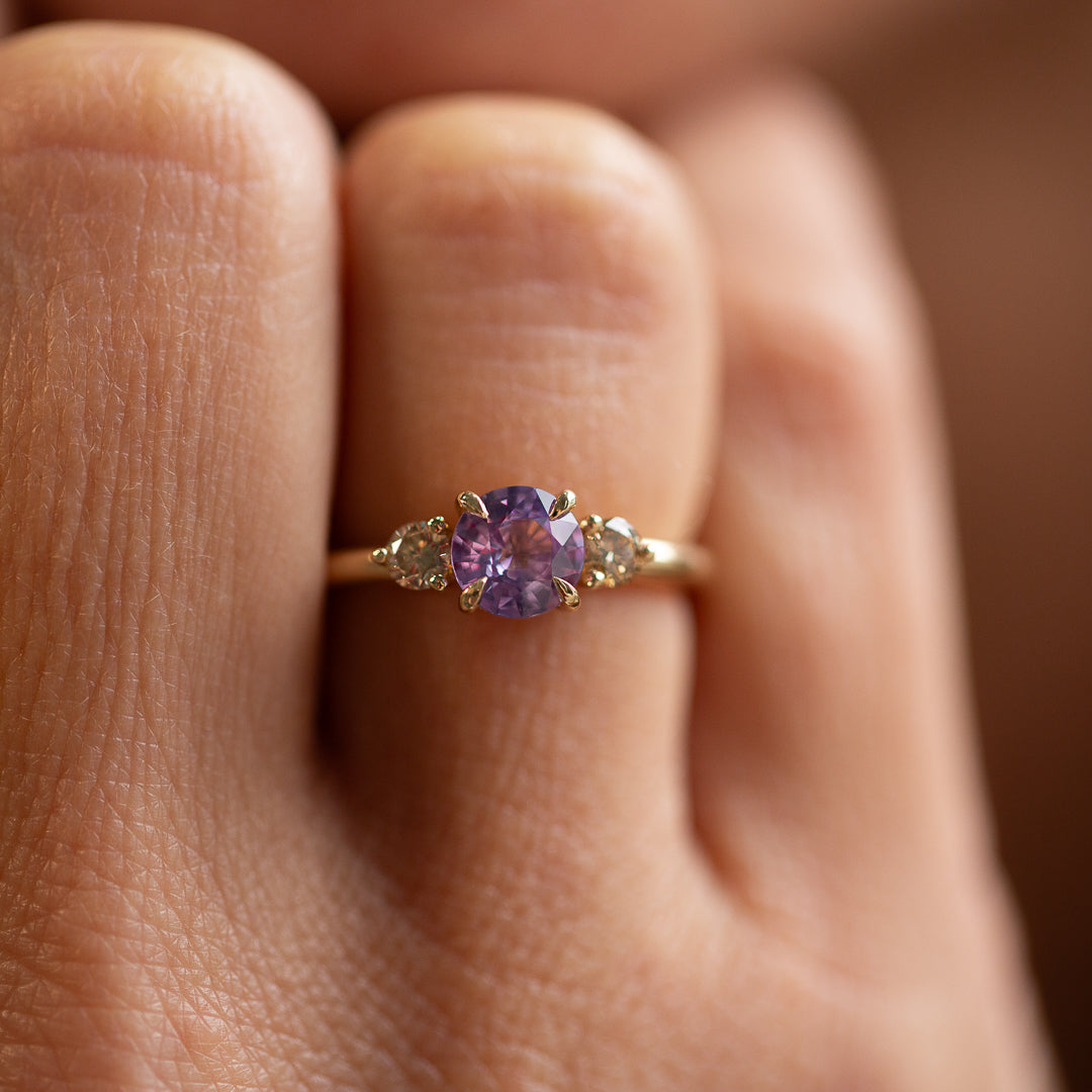 The Violet Gray Trinity design — a timeless three-stone setting, reimagined. Traditionally it is said to be symbolic of the past, present, and future (each stone holds space for memory, presence, and hope).