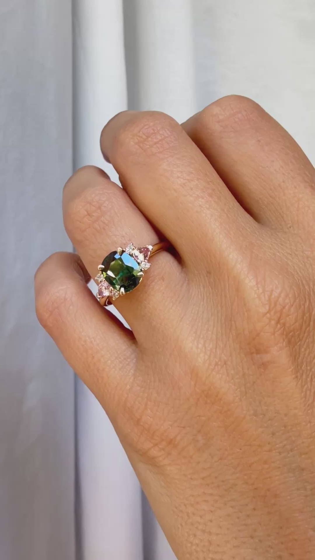 At its heart, another heirloom Australian sapphire, mined and cut in ’71/’72, long kept hidden and now brought to light. On either side, light pink Sapphires and bright White Diamonds stretch like symmetrical wings – balanced, luminous, and gently in motion.