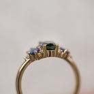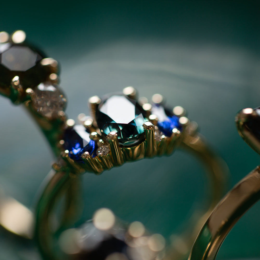 We have intentionally clustered together a combination of natural Blue & Teal Australian Sapphires and White Diamonds into a symmetrical 14k Yellow Gold setting; low to the hand to ensure comfort and wearability is of optimal importance.