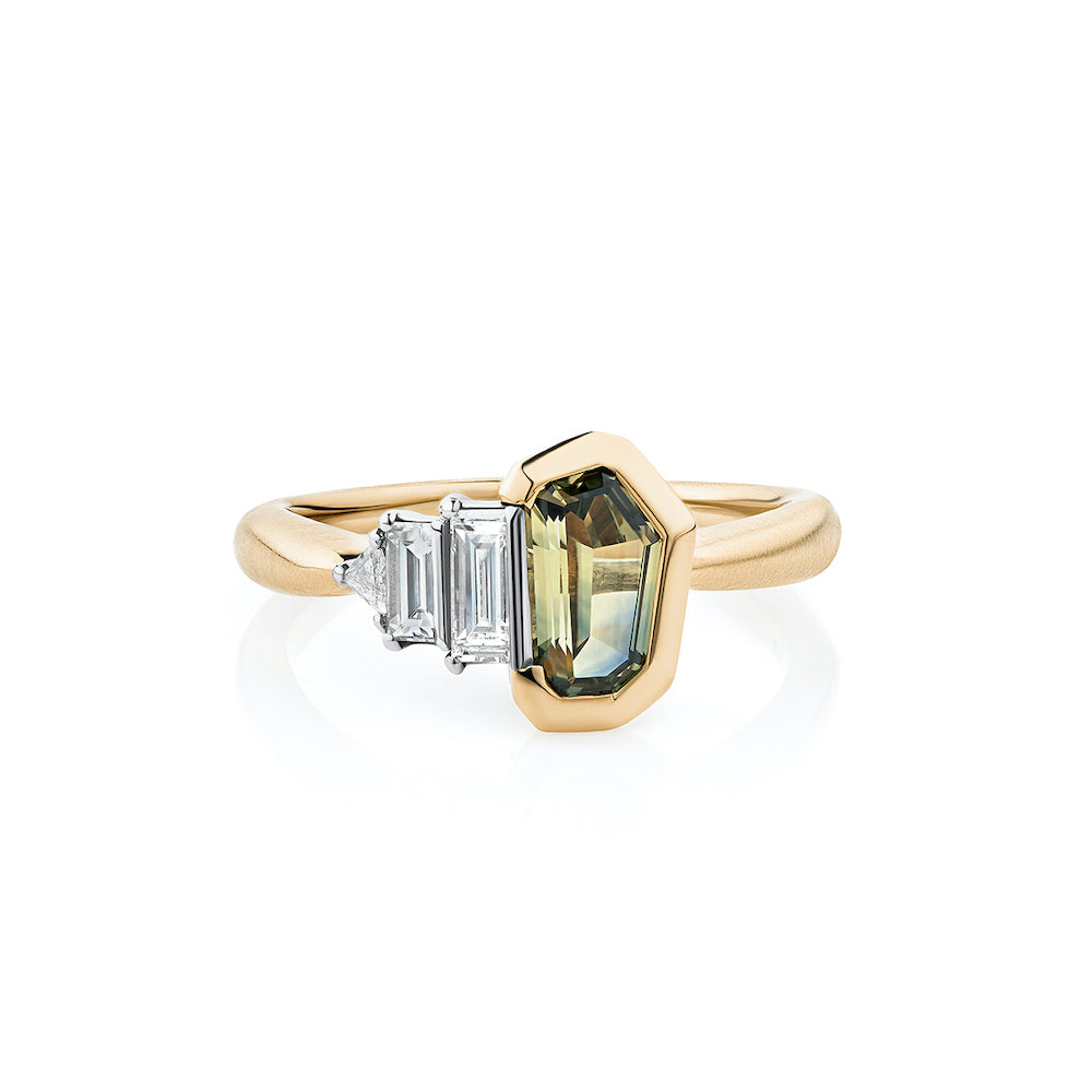 A unique ring design combining an Earth-grown freeform Australian Sapphire, high quality White Diamonds (x3) and an intentional choice of combined metals incorporating 14k White and Yellow Gold in the setting.