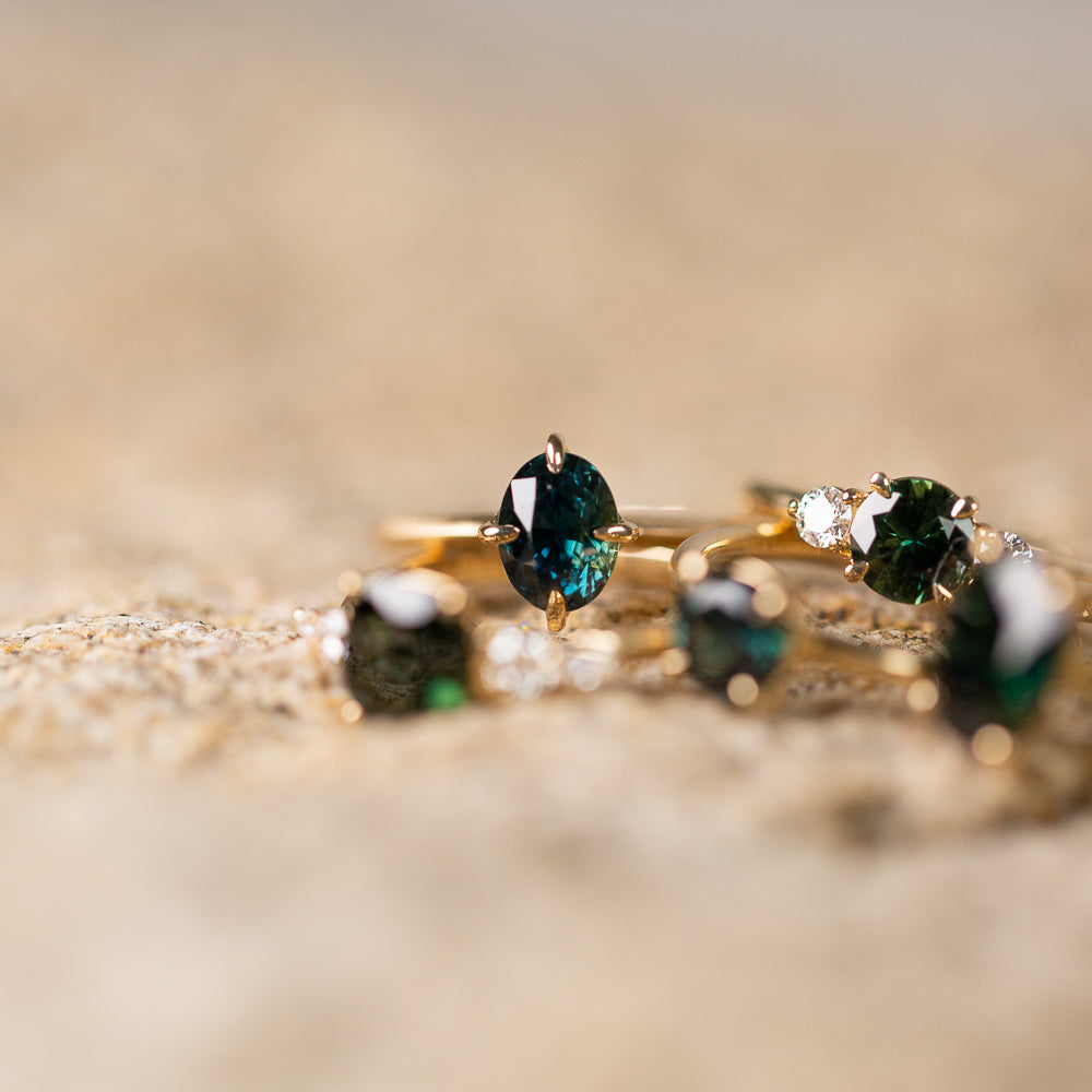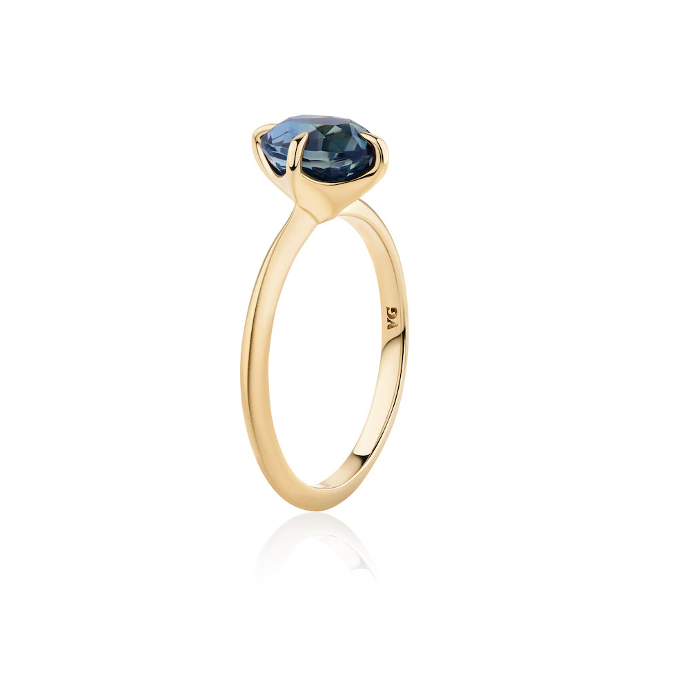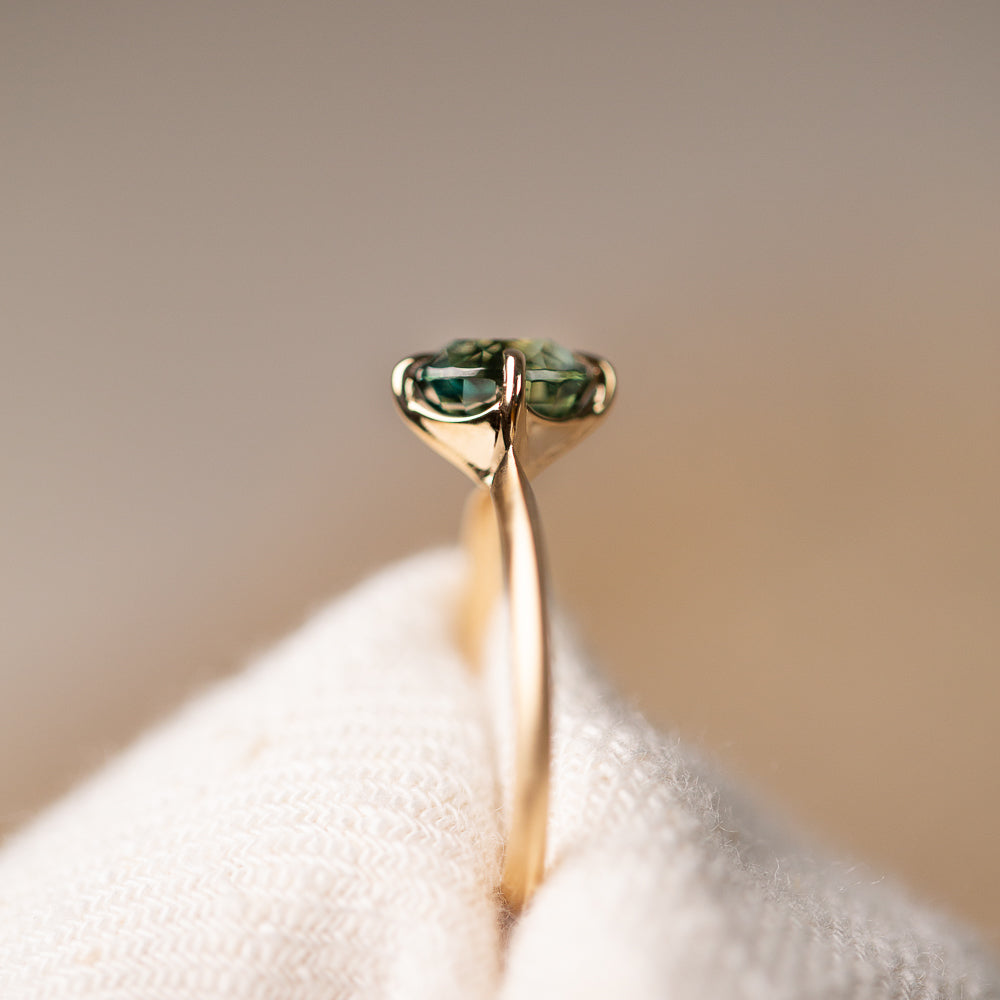 Your vibrant Peacock Madagascan Sapphire has been ethically sourced and cut, with no treatments. The four tapered claws have been intentionally placed at the N-E-S-W placements and then combined with a matte finished knife-edge band, which makes it feel both modern and edgy.