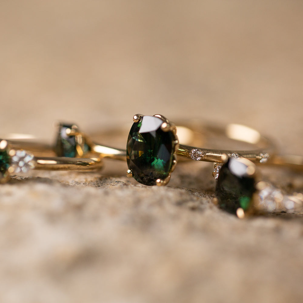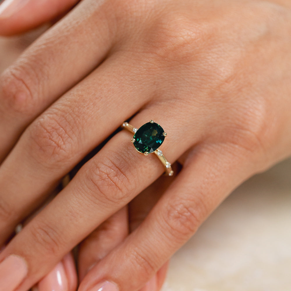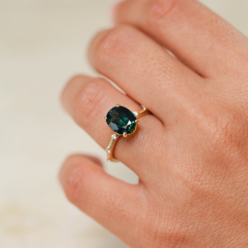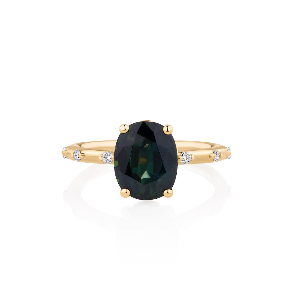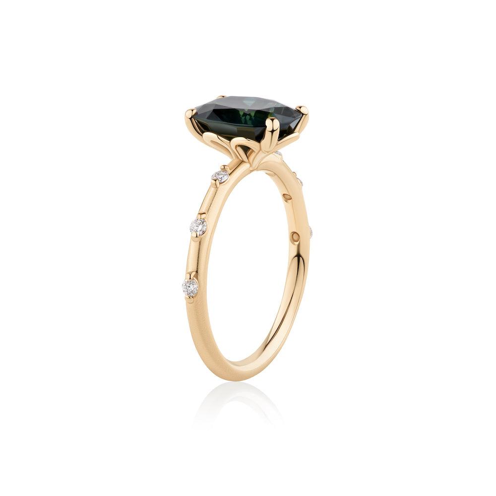 The Violet Gray Tuva ring is a Solitaire design, with golden beading and Diamonds sweetly placed along the band. It has been created with 4 rounded claws holding your 2.5ct Australian Sapphire and a petal-like floral design on the under side of the stone setting.