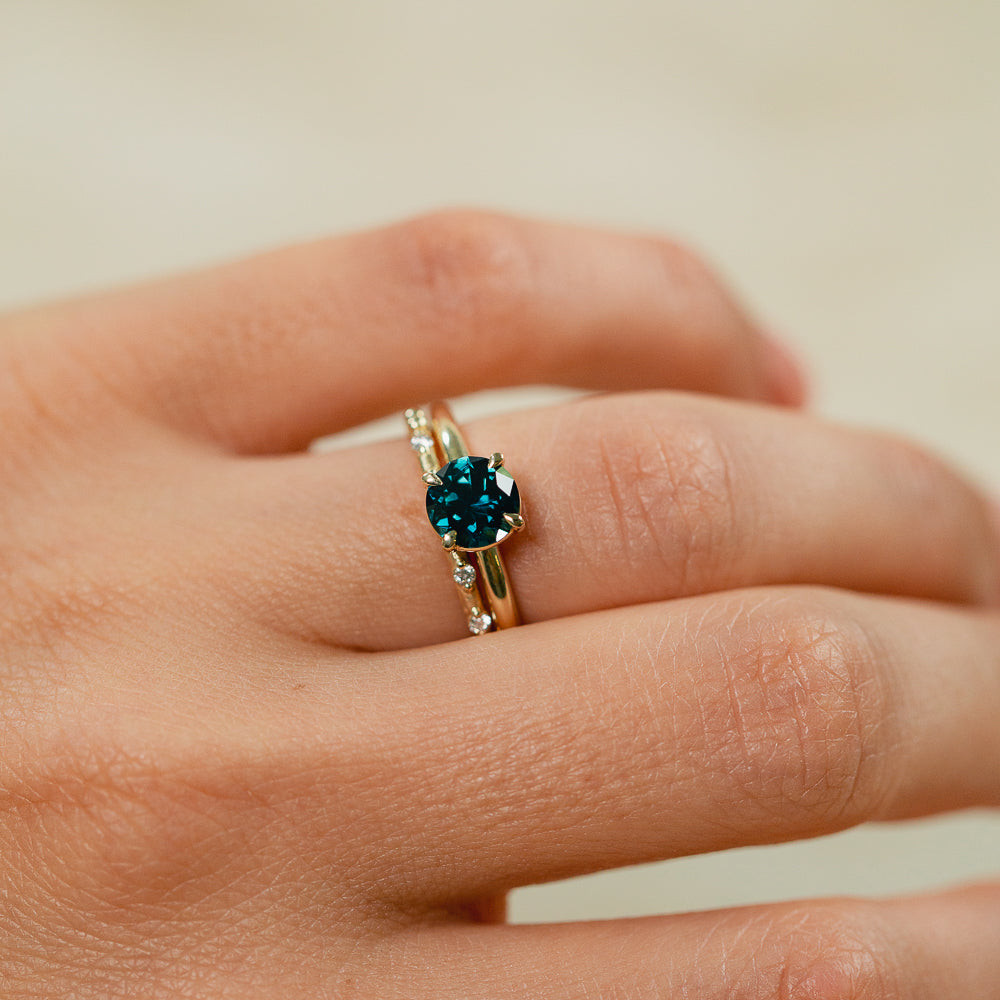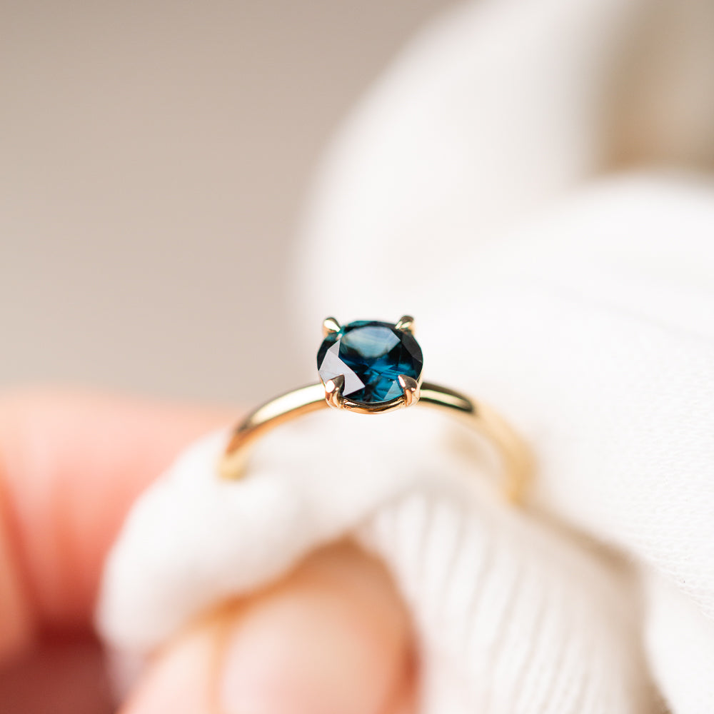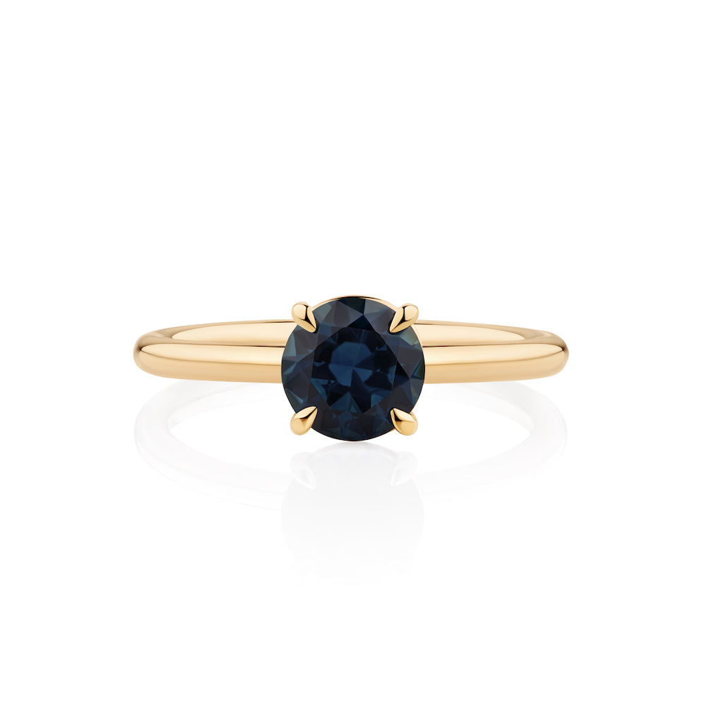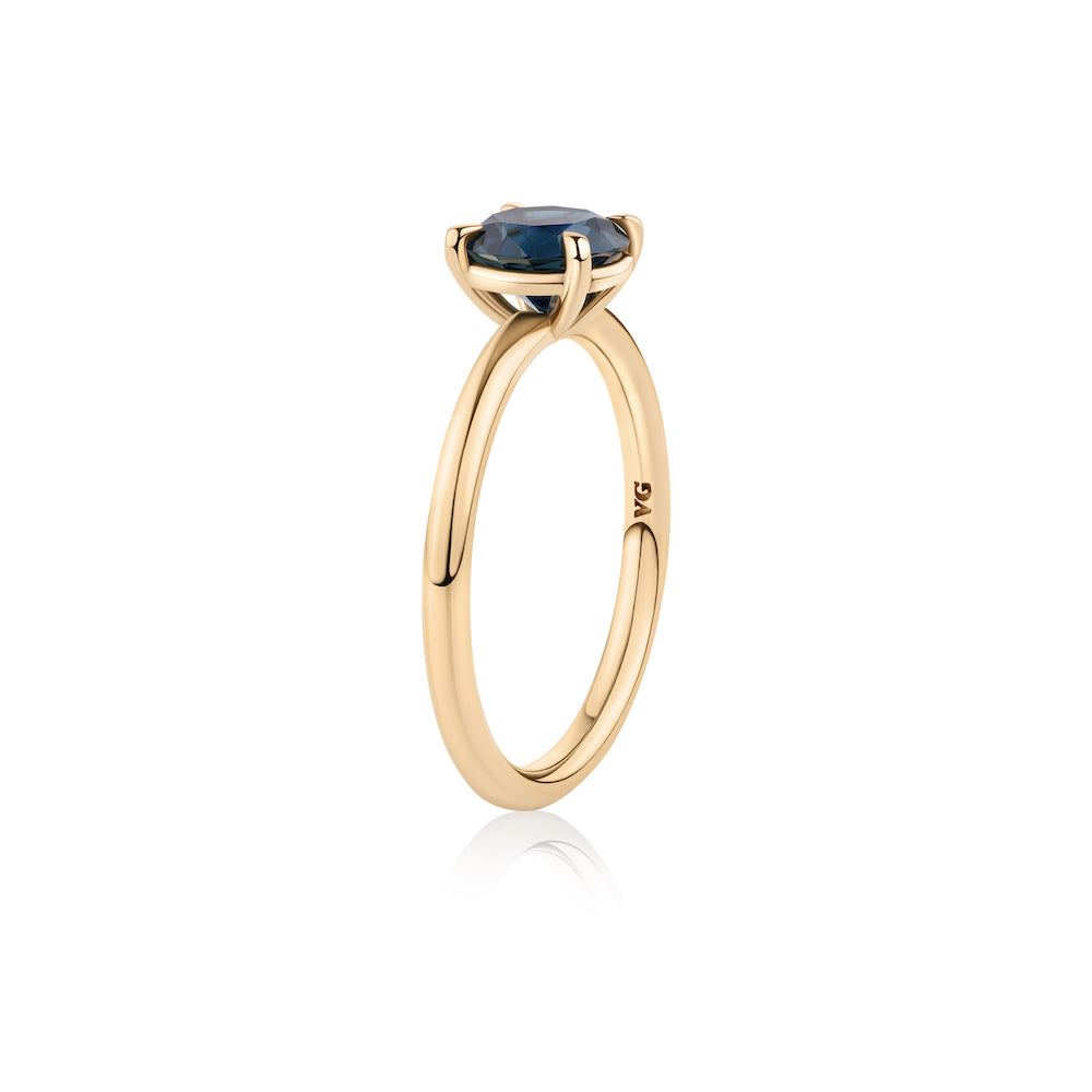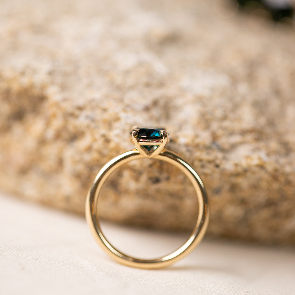 The Sapphire may appear singular in colour as the sky darkens, yet when the daylight hits her you will captivated by her natural flashes of colour diversity – dark blue, green and yellow. The design combines a 4 claw, minimal basket setting intentionally sunk low into a half round, matte finished band.