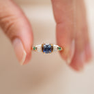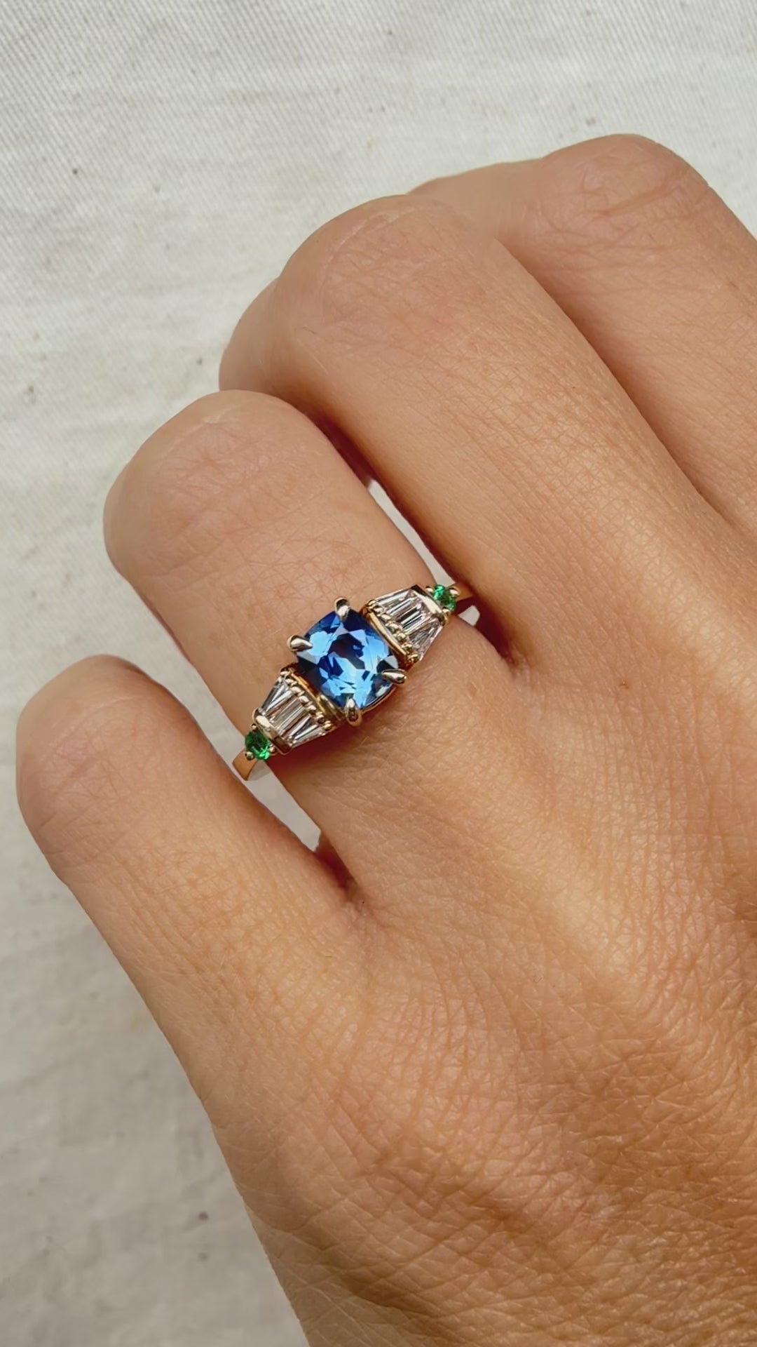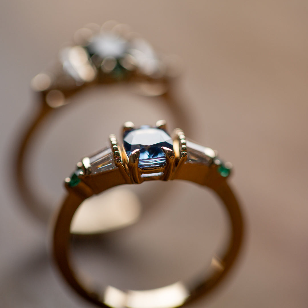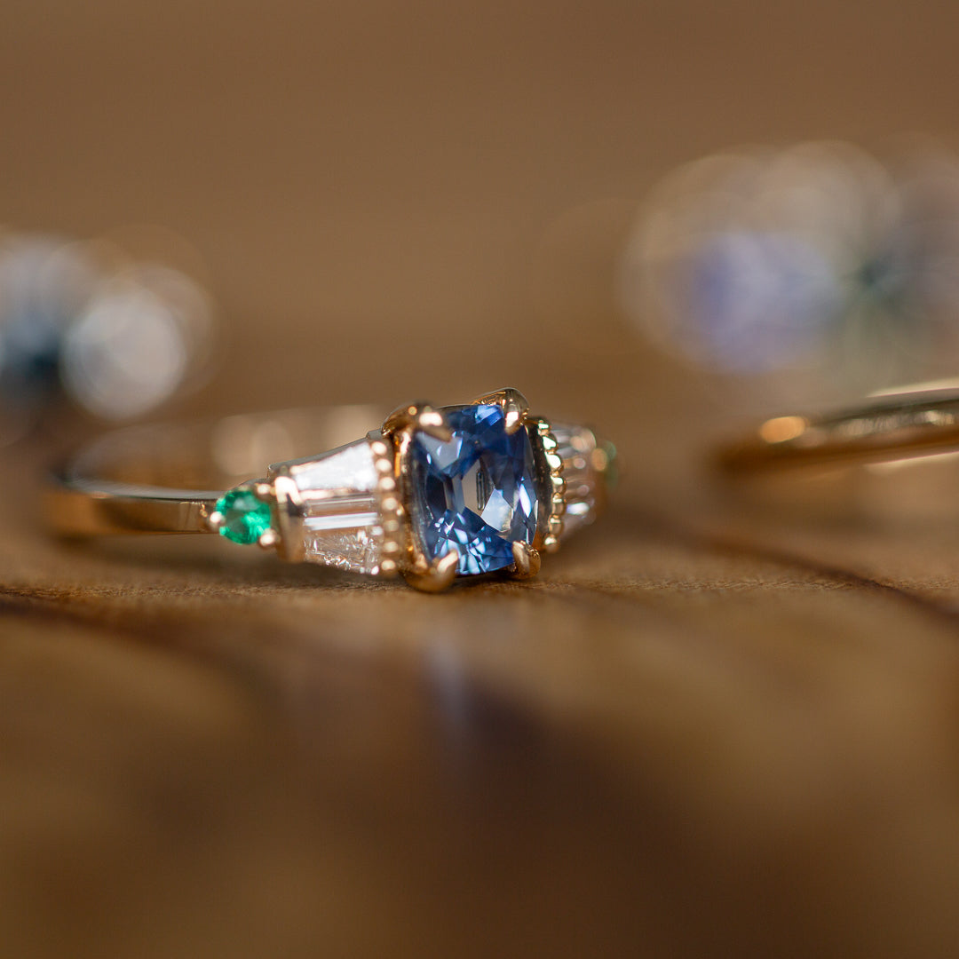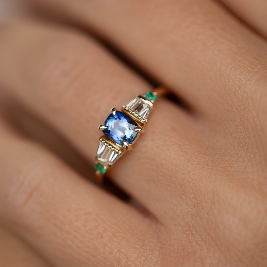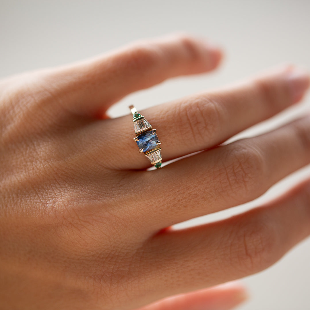 Coralla is a meeting of earth and ocean — a modern silhouette shaped with subtle Art Deco lines. A bright Australian Blue Sapphire has been set front and centre, framed by tapered baguette Diamonds and a pop of Emerald (Green) on each side. Together, they create a palette that feels distinctly Aussie: ocean horizons, lush landscapes, and clean, architectural light.