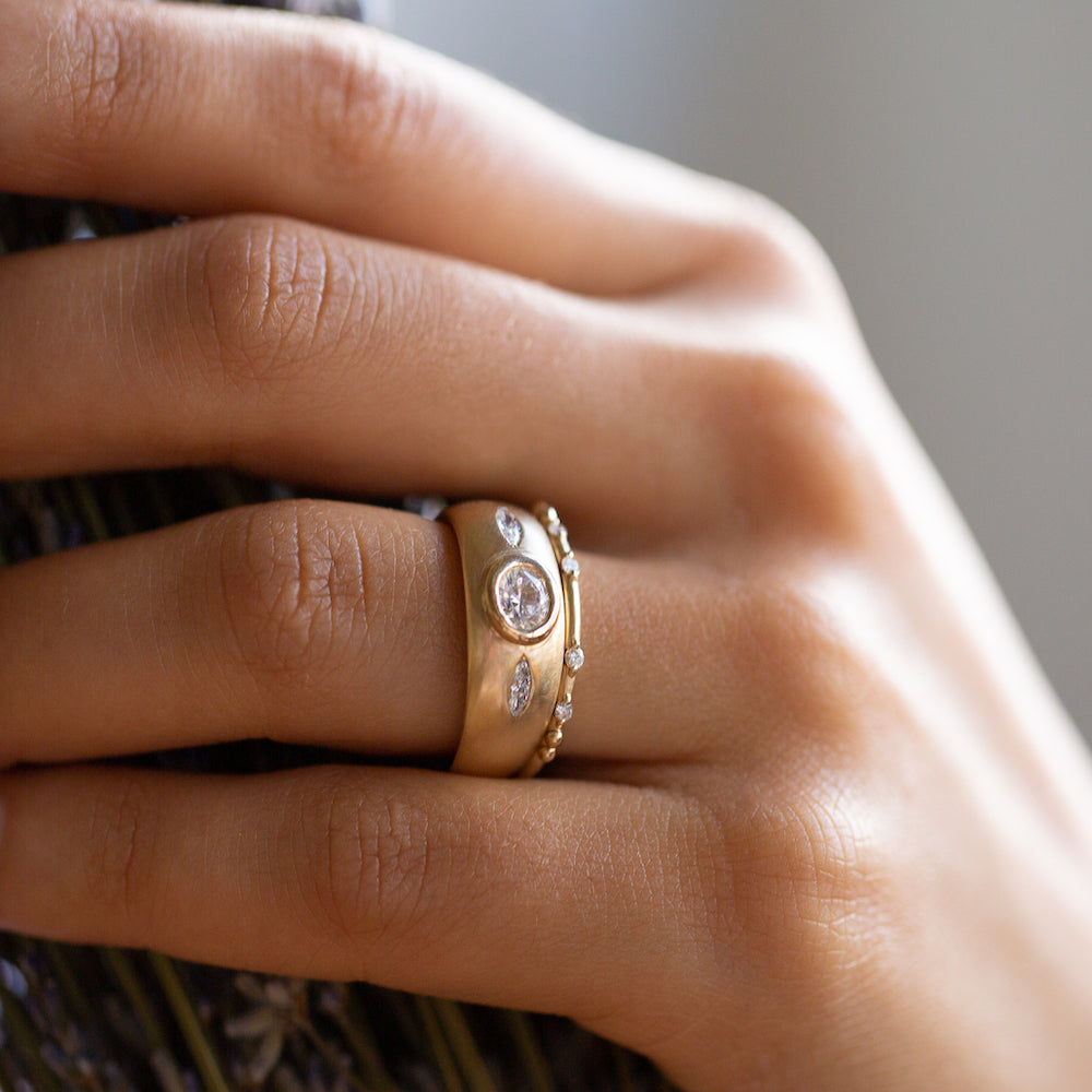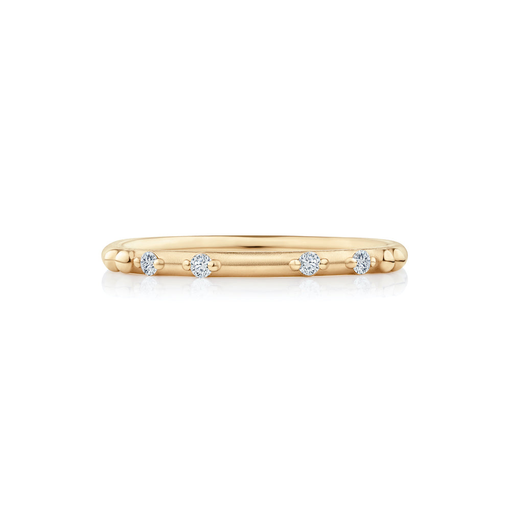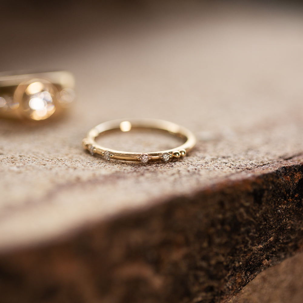 A simple and sweet halo gold band with petite Diamond detailing and golden beading. Perfect to add a little more sparkle to your stack and a very loved Violet Gray piece.