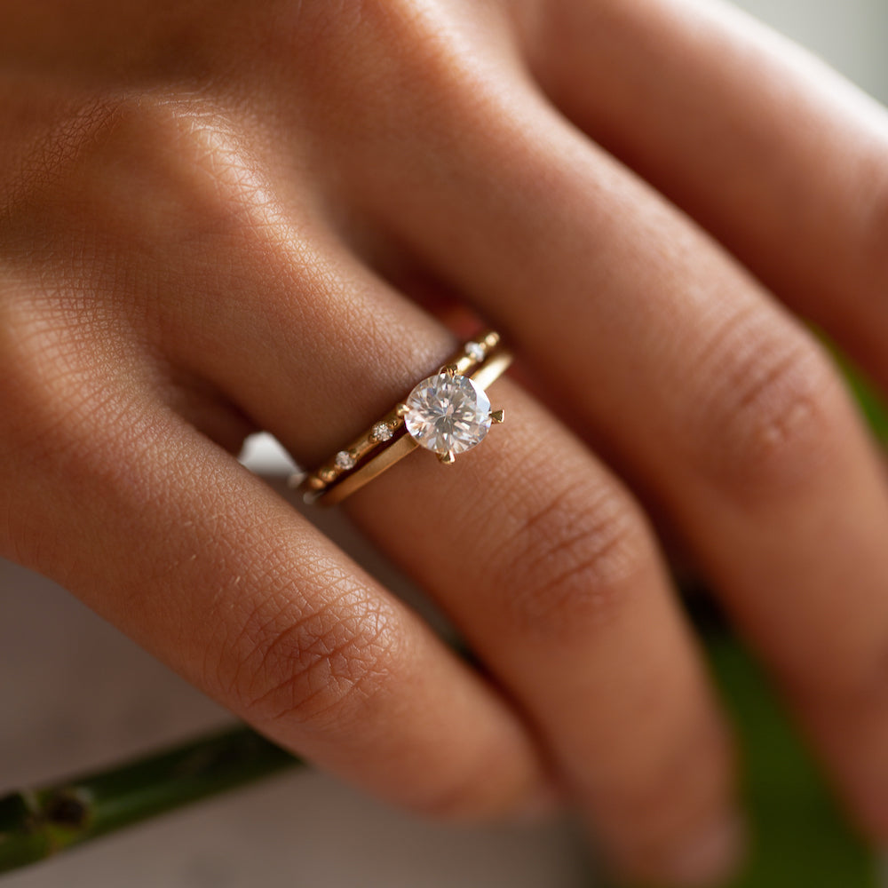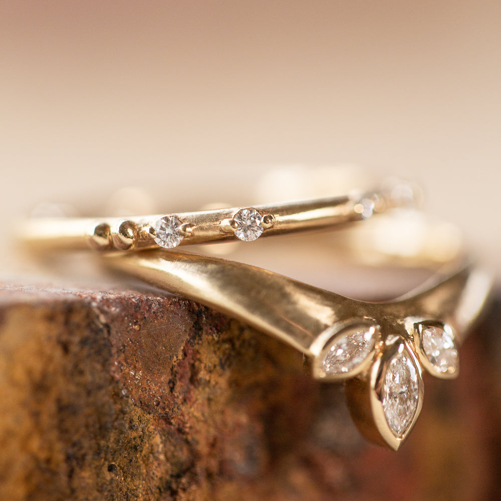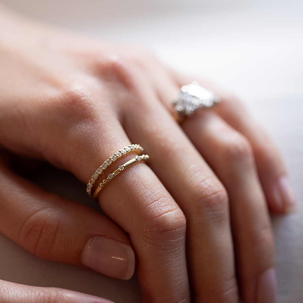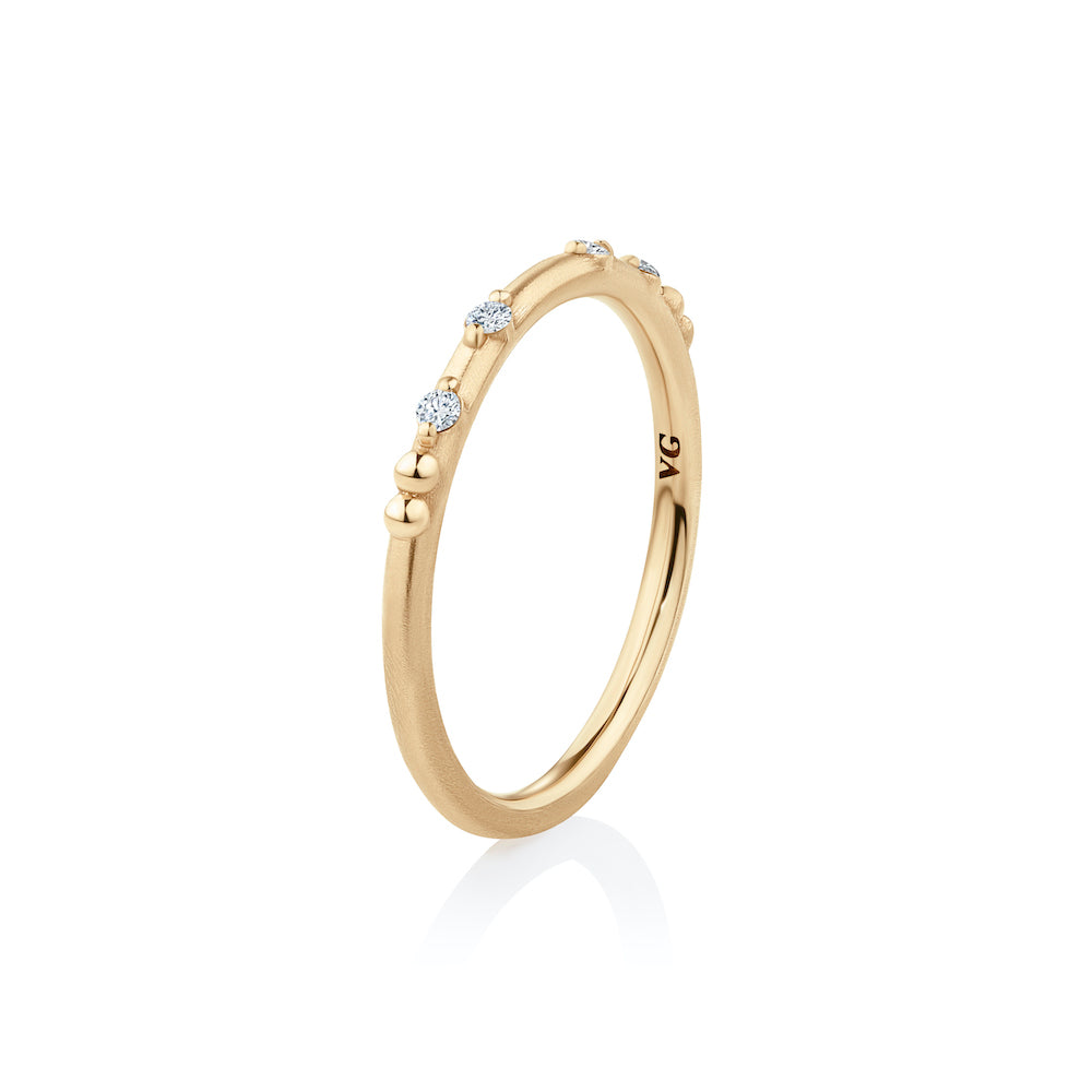 A simple and sweet halo gold band with petite Diamond detailing and golden beading. Perfect to add a little more sparkle to your stack and a very loved Violet Gray piece.