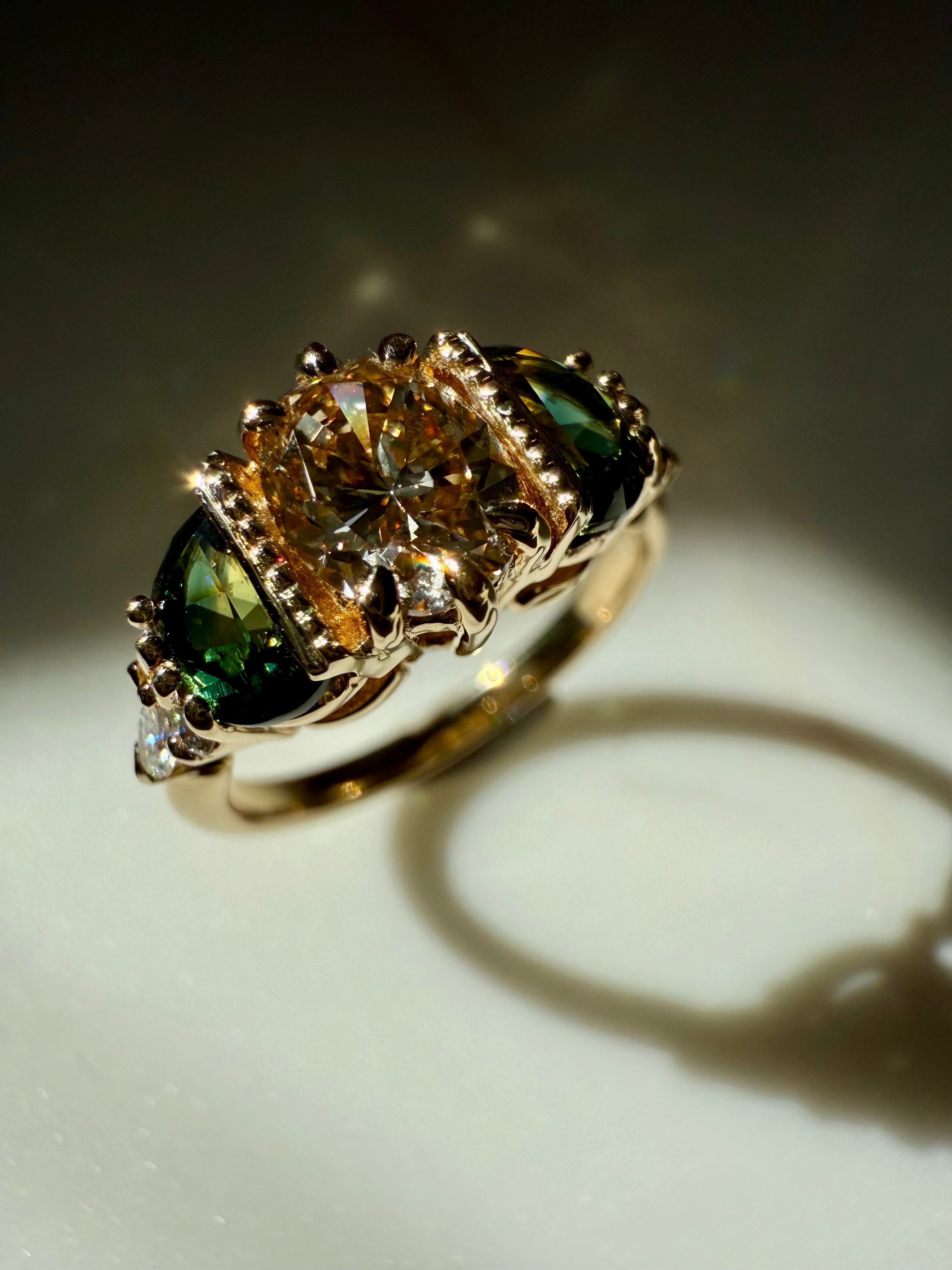 COGNAC DIAMOND, GREEN SAPPHIRE & WHITE DIAMONDS | 14K YELLOW GOLD